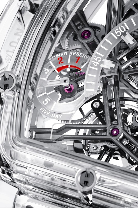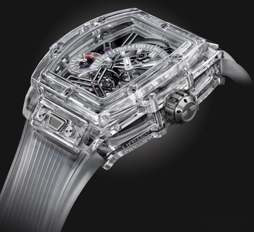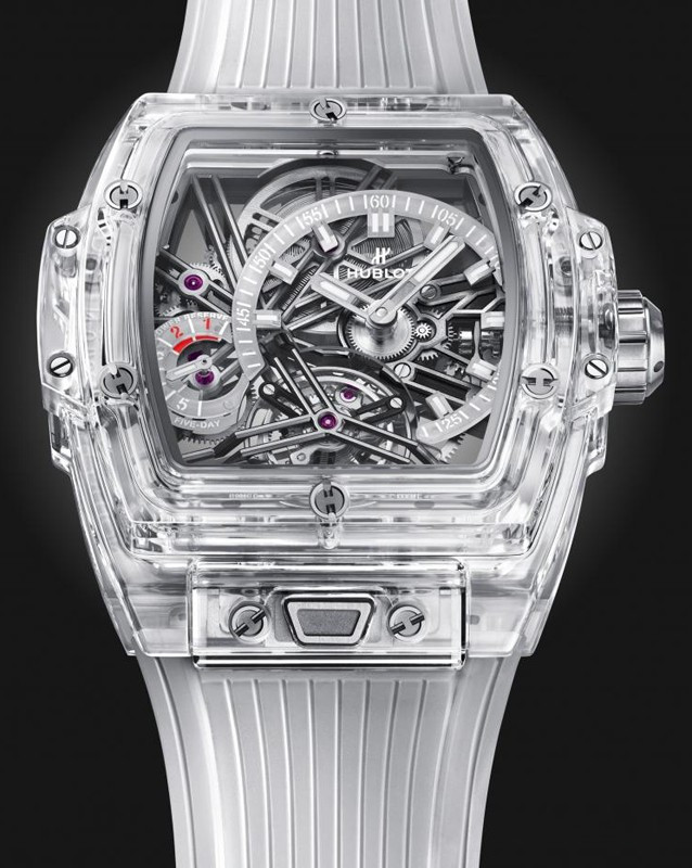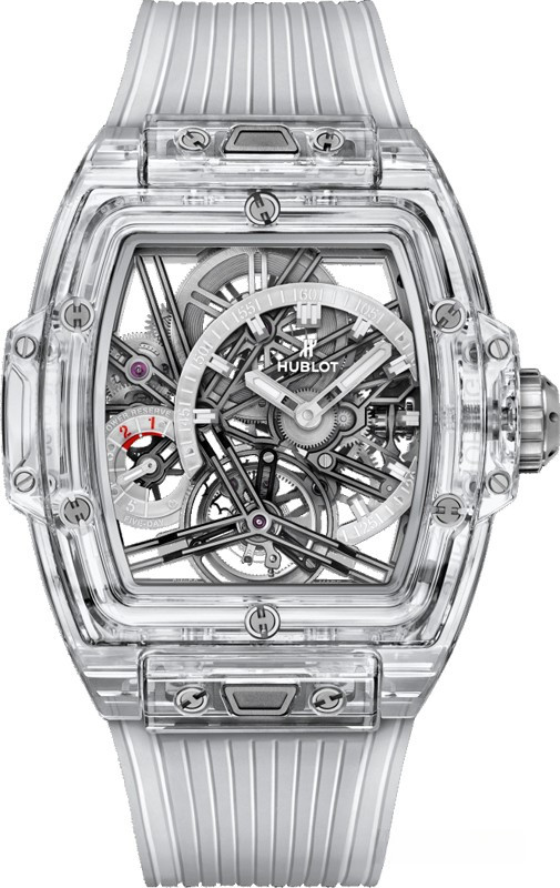 Часы Hublot Spirit of Big Bang Tourbillon Carbon 42 mm представлены в корпусе из сапфира диаметром 42 мм и водонепроницаемостью 30 метров. Внутри корпуса установлен механизм с ручным заводом, Калибр HUB6020, обладающий запасом хода 115 часов. На серебристом скелетированном циферблате отображаются часы, минуты, запас хода, клеть турбийона. Часы поставляются на каучуковом ремешке с титановой вставкой. Серия ограничена - 50 шт.