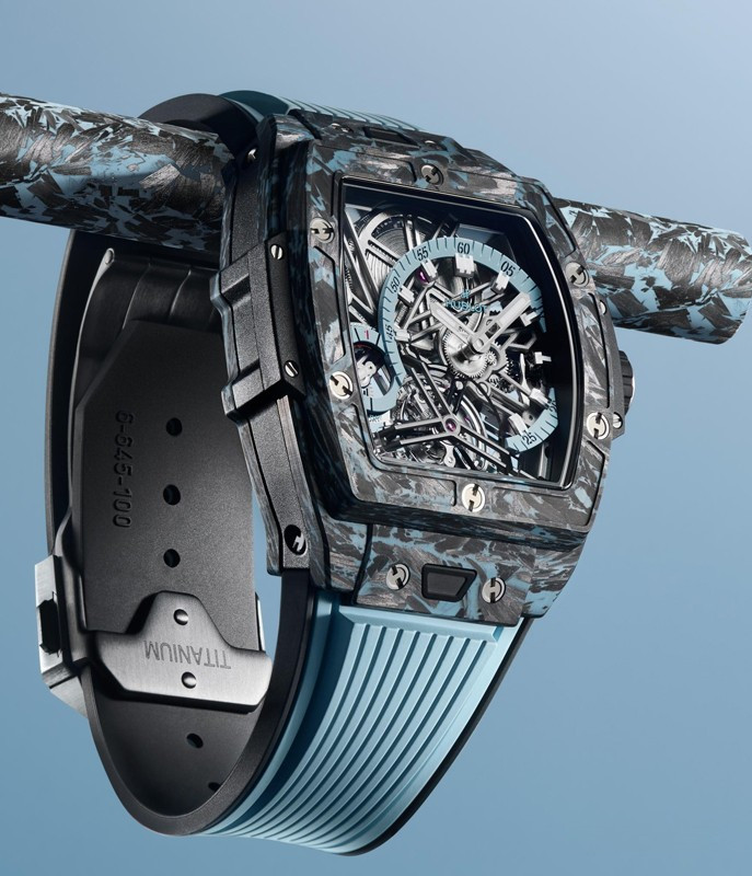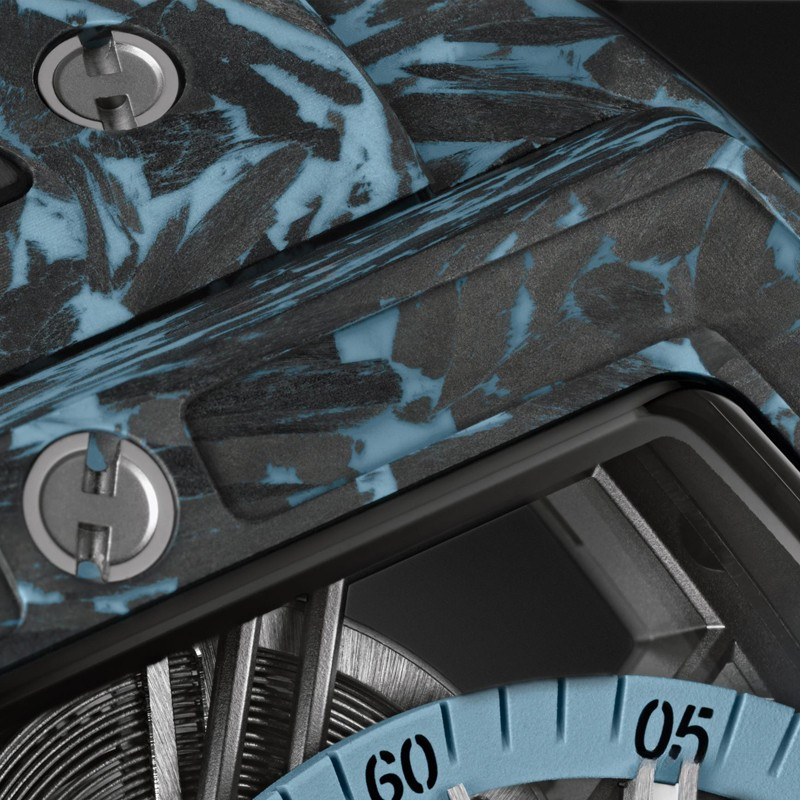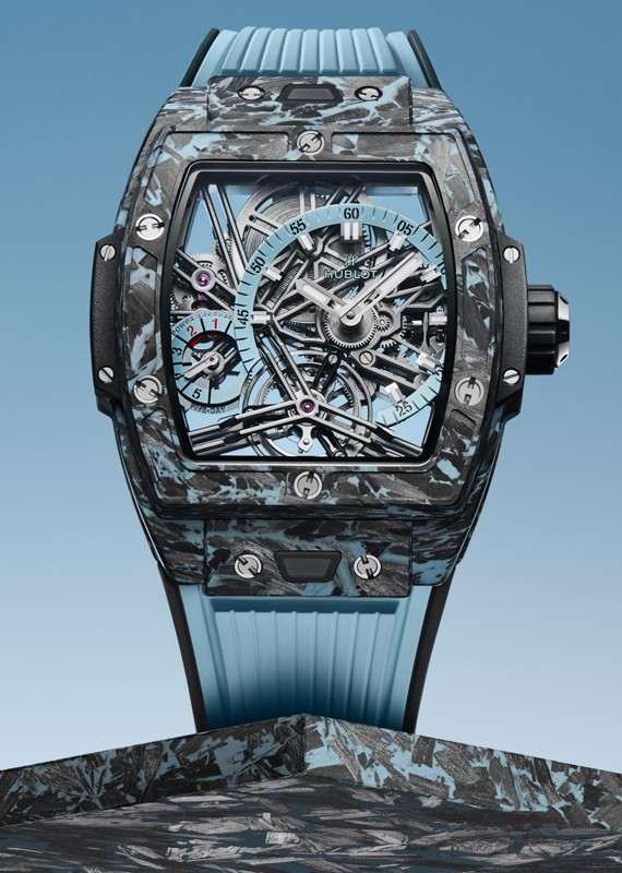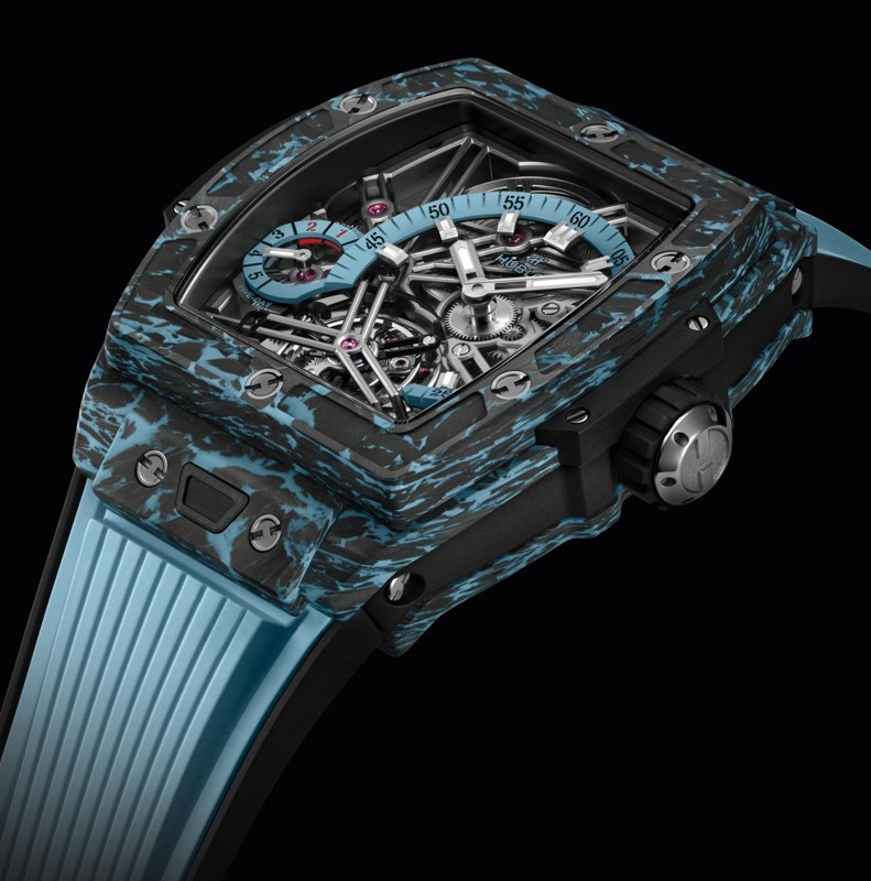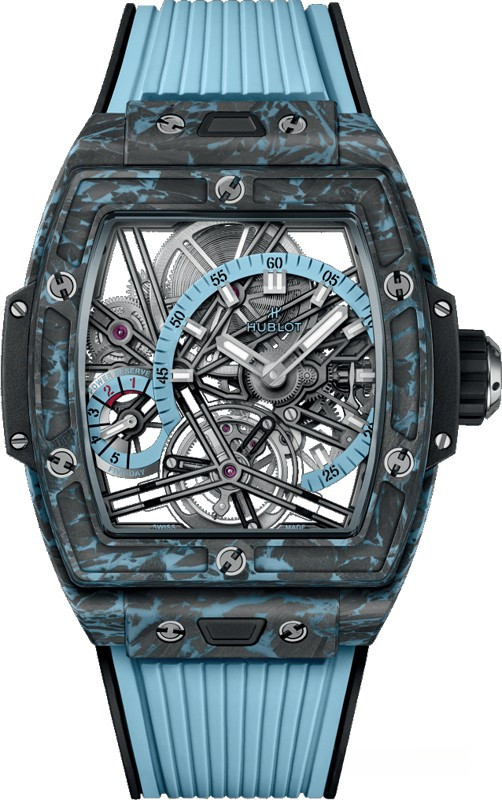 Часы Hublot Spirit of Big Bang Tourbillon 42 mm представлены в корпусе из карбона диаметром 42 мм и водонепроницаемостью 30 метров. Внутри корпуса установлен механизм с ручным заводом, Калибр HUB6020, обладающий запасом хода 115 часов. На голубом скелетированном циферблате отображаются часы, минуты, запас хода, клеть турбийона. Часы поставляются на каучуковом ремешке с титановой застежкой. Серия ограничена - 50 шт.