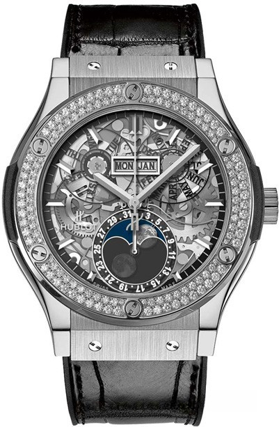 Женские часы Hublot Classic Fusion Aeromoon 547.NX.0170.LR.1104 выпущены в корпусе Classic Fusion диаметром 42 mm из титана. Безель корпуса выпущен из титана с 6 H-образными полированными титановыми винтами с утопленной головкой, инкрустирован белыми бриллиантами. Над циферблатом установлено сапфировое стекло с антибликовым покрытием. Выступы безеля: черный композитный материал, заводная головка из титана с выгравированной буквой Н для «Hublot». Задняя часть корпуса открытая, из титана с сапфировым стеклом с внутренним антибликовым покрытием. Водонепроницаемость составляет приблизительно 50 м. На сером циферблате расположены полированные покрытые родием жезлообразные индексы и стрелки. Часовой механизм HUB1131 с автоматическим заводом имеет запас хода 42 часа. Индикатор фазы Луны находится в позиции 6 часов, аналоговый индикатор даты в позиции 6 часов, окошко для индикации дней и месяцев в позиции 12 часов. Ремешок из черной кожи аллигатора, нашитой на черном каучуке с таким же черным швом. Раскладная застежка из нержавеющей стали с черным вакуумным напылением.