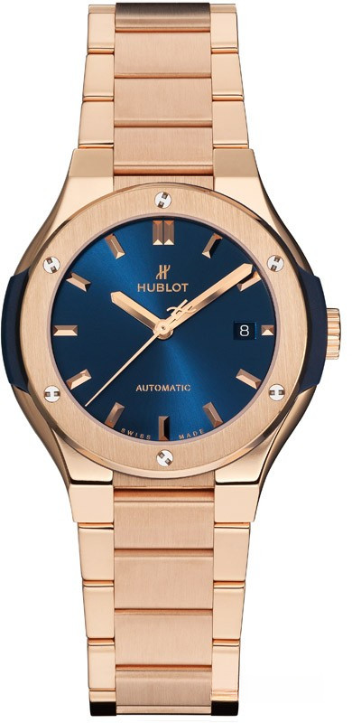 Классическая модель наручных часов Classic Fusion Blue King Gold была представлена компанией Hublot. Элегантный корпус выполнен из матового розового золота 18к с полировкой, часы доступны в размере 33 мм. Золотой безель закреплен 6 Н-образными золотыми винтами. Сапфировое стекло с антибликовым покрытием надежно защищает циферблат синего цвета с эксклюзивным гильоше. Окружность циферблата украшена часовыми метками багетной формы. В центре разместились указательные стрелки: часовая, минутная и секундная (украшена логотипом компании). В положении 3 часа разместилось окошко показывающее дату по календарю. Заводная головка размещенная по соседству, которая настраивает все функции часов. Корпус скрывает в себе часовой механизм с автоматическим подзаводом, Калибр HUB1120. Обеспечивает беспрерывный ход 40 часов. Часы комплектуются золотым браслетом.