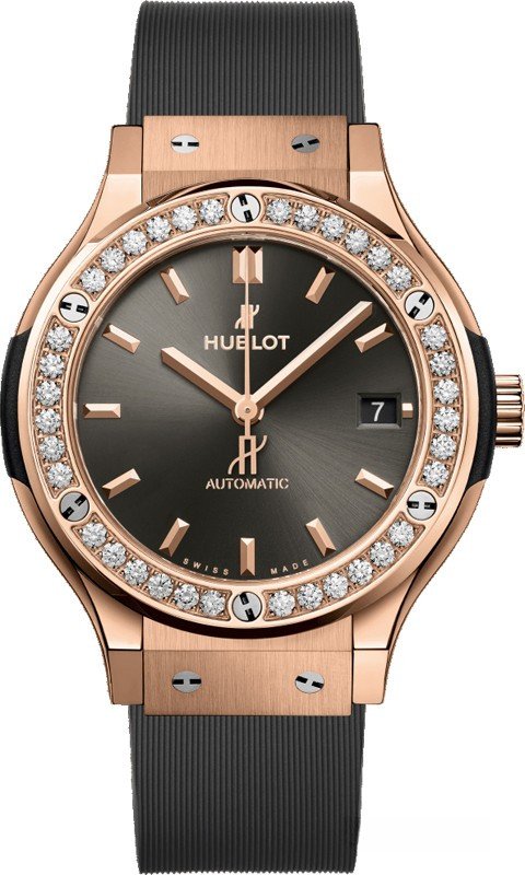 Часы Classic Fusion представлены в корпусе из розового золота 18к диаметром 38 мм с водонепроницаемостью до 50 метров. Сапфировое стекло с антибликовым покрытием надежно защищает серый циферблат. В центре разместились часовая, минутная и секундная стрелки, апертура даты расположена на 3-х часах. Часы поставляются на ремешке из каучука. Внутри корпуса установлен часовой механизм с автоматическим подзаводом, Калибр HUB1110, обладающий запасом хода 42 часа. Безель из белых бриллиантов.