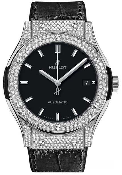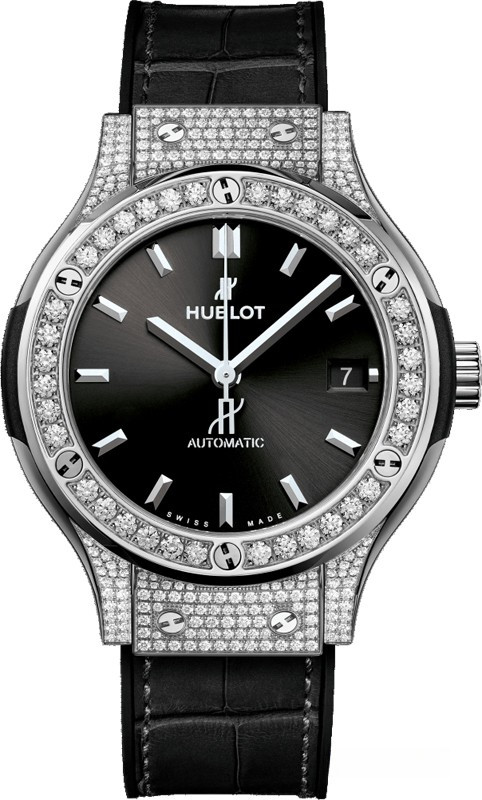 Часы Classic Fusion представлены в корпусе из титана диаметром 38 мм с водонепроницаемостью до 50 метров. Безель из белых бриллиантов закреплен 6 Н-образными винтами. Сапфировое стекло с антибликовым покрытием надежно защищает циферблат. В центре разместились часовая, минутная и секундная стрелки, апертура даты расположена на 3-х часах. Часы поставляются на ремешке из кожи аллигатора. Внутри корпуса установлен часовой механизм с автоматическим подзаводом, Калибр HUB1110, обладающий запасом хода 42 часа. Корпус инкрустирован белыми бриллиантами.