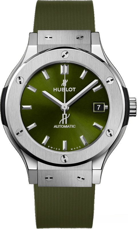 Часы Classic Fusion представлены в корпусе из титана диаметром 38 мм с водонепроницаемостью до 50 метров. Сапфировое стекло с антибликовым покрытием надежно защищает зеленый циферблат. В центре разместились часовая, минутная и секундная стрелки, апертура даты расположена на 3-х часах. Часы поставляются на ремешке из каучука. Внутри корпуса установлен часовой механизм с автоматическим подзаводом, Калибр HUB1110, обладающий запасом хода 42 часа.