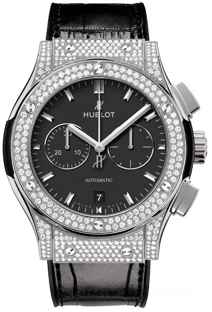 Часы Hublot Classic Fusion Fusion Chronograph Titanium 42 mm 541.NX.1171.LR.1704 обладают круглым корпусом из титана, диаметром 42 мм, водонепроницаемостью до 50 м. Корпус инкрустирован белыми бриллиантами. На торце рифленой заводной головки, расположенной на 3 часах, имеется логотип в виде большой буквы Н. Сапфировое стекло установлено на передней стороне часового корпуса (с антибликовым покрытием) и на его завинчивающейся задней крышке. Циферблат черного цвета. На циферблате симметрично расположены накопители хронографа. Модель оснащена мануфактурным автоматическим швейцарским механизмом. Калибр HUB 1143 с 42-часовым запасом хода, с функциями индикации часов, минут (посредством соответствующих центральных стрелок), секунд и даты (посредством апертуры в позиции 6 часов). Калибр отменно отделан и декорирован. Поставляется на ремешке из каучука и кожи аллигатора с вставкой из нержавеющей стали.