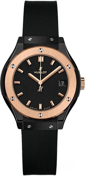 Часы Classic Fusion представлены в корпусе из керамики и розового золота 18к диаметром 33 мм с водонепроницаемостью до 50 метров. Сапфировое стекло с антибликовым покрытием надежно защищает черный циферблат. Окружность циферблата украшена часовыми метками багетной формы. В центре разместились часовая, минутная и секундная стрелки, апертура даты расположена на 3-х часах. Часы поставляются на каучуковом ремешке с вставкой из титана. Внутри корпуса установлен кварцевый часовой механизм HUB2912.