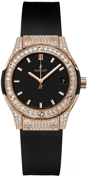 Часы Classic Fusion 581.OX.1181.RX.1704 представлены в корпусе из розового золота 18к диаметром 33 мм с водонепроницаемостью до 50 метров. Сапфировое стекло с антибликовым покрытием надежно защищает циферблат черного цвета. Окружность циферблата украшена часовыми метками багетной формы. В центре разместились часовая, минутная и секундная стрелки, апертура даты расположена на 3-х часах. Ремешок из каучука с раскладывающейся застежкой из розового золота 18к. Внутри корпуса установлен кварцевый часовой механизм HUB2912. Корпус инкрустирован белыми бриллиантами.