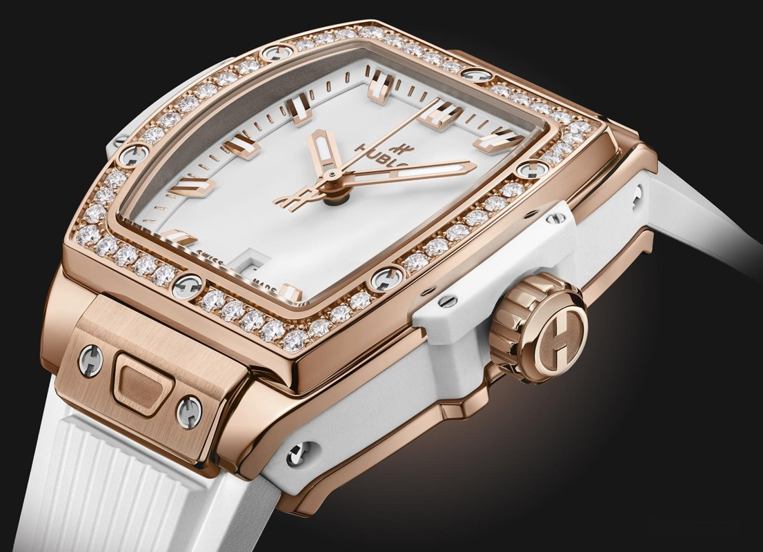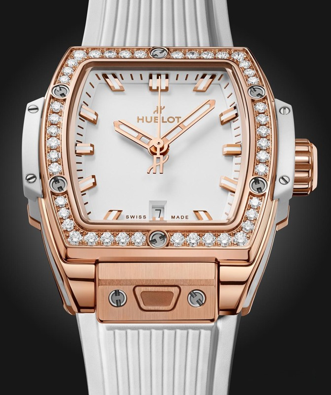Часы Hublot Spirit of Big Bang 32 mm представлены в корпусе из розового золота 18к размером 32 мм и водонепроницаемостью до 100 метров. Внутри корпуса установлен автоматический механизм, Калибр HUB1120 с запасом хода 40 часов. На белом циферблате отображаются часы, минуты, секунды, дата. Часы комплектуются каучуковым ремешком с золотой застежкой. Безель из белых бриллиантов.