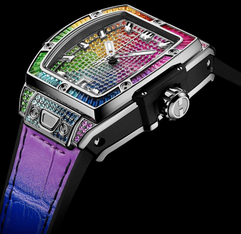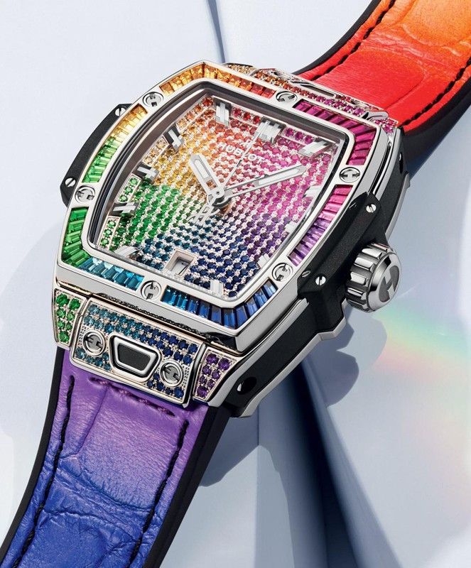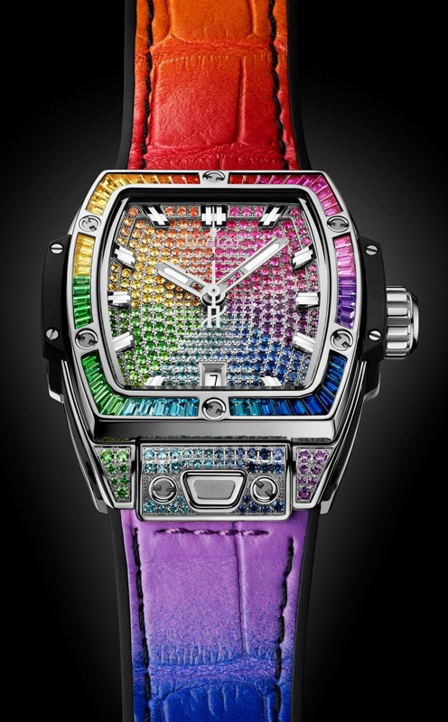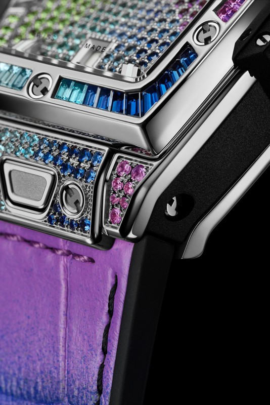 Часы Hublot Spirit of Big Bang 32 mm представлены в корпусе из нержавеющей стали размером 32 мм и водонепроницаемостью до 100 метров. Внутри корпуса установлен автоматический механизм, Калибр HUB1120 с запасом хода 40 часов. На циферблате с разноцветными драгоценными камнями отображаются часы, минуты, секунды, дата. Часы комплектуются ремешком из кожи аллигатора с застежкой из нержавеющей стали. Корпус инкрустирован разноцветными драгоценными камнями.