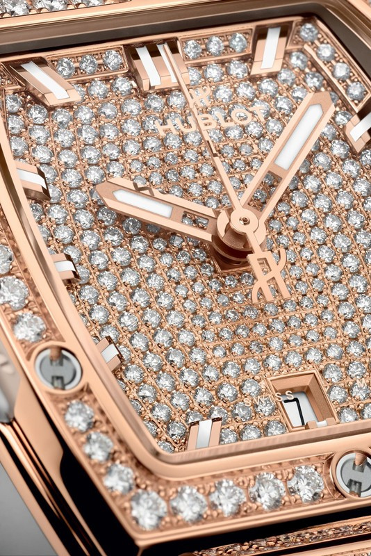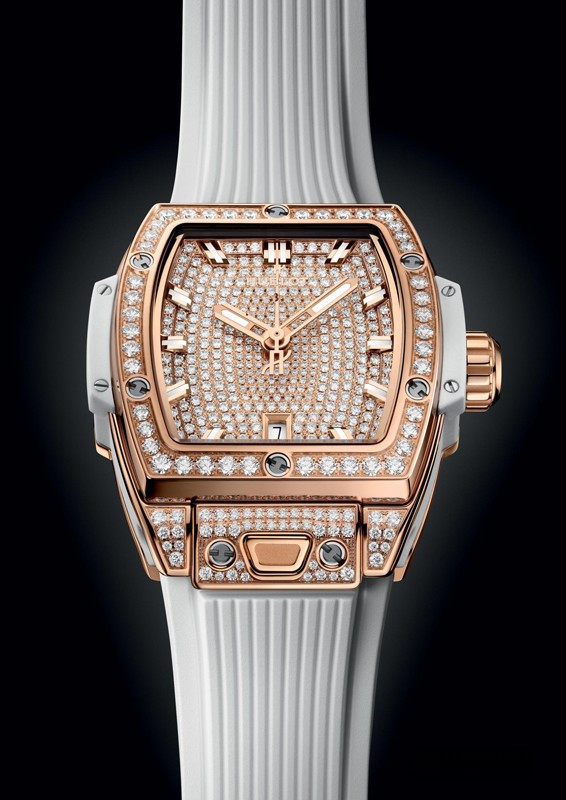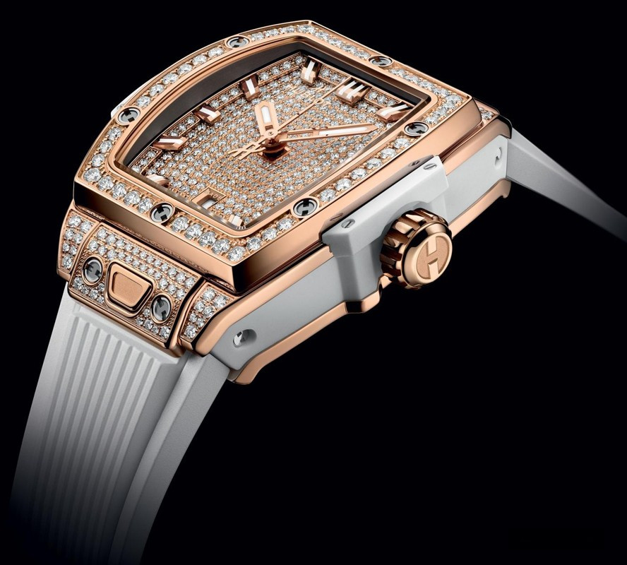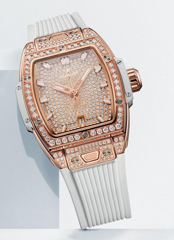 Часы Hublot Spirit of Big Bang 32 mm представлены в корпусе из розового золота 18к размером 32 мм и водонепроницаемостью до 100 метров. Внутри корпуса установлен автоматический механизм, Калибр HUB1120 с запасом хода 40 часов. На циферблате с белыми бриллиантами отображаются часы, минуты, секунды, дата. Часы комплектуются каучуковым ремешком с золотой застежкой. Корпус инкрустирован белыми бриллиантами.
