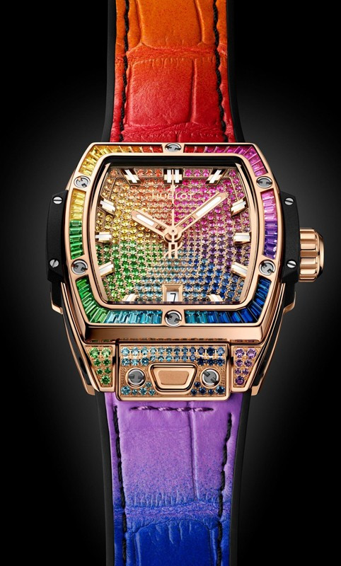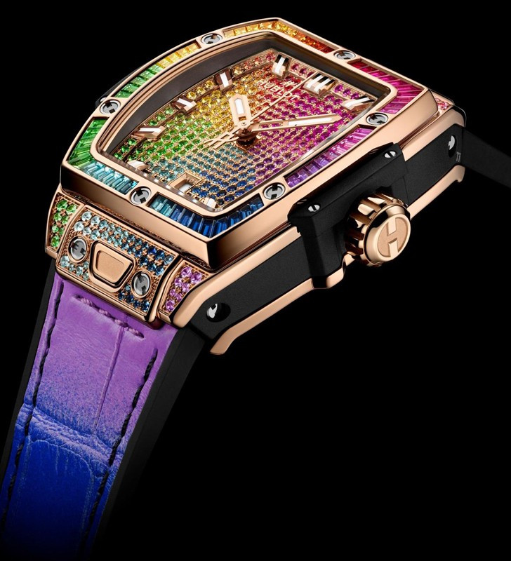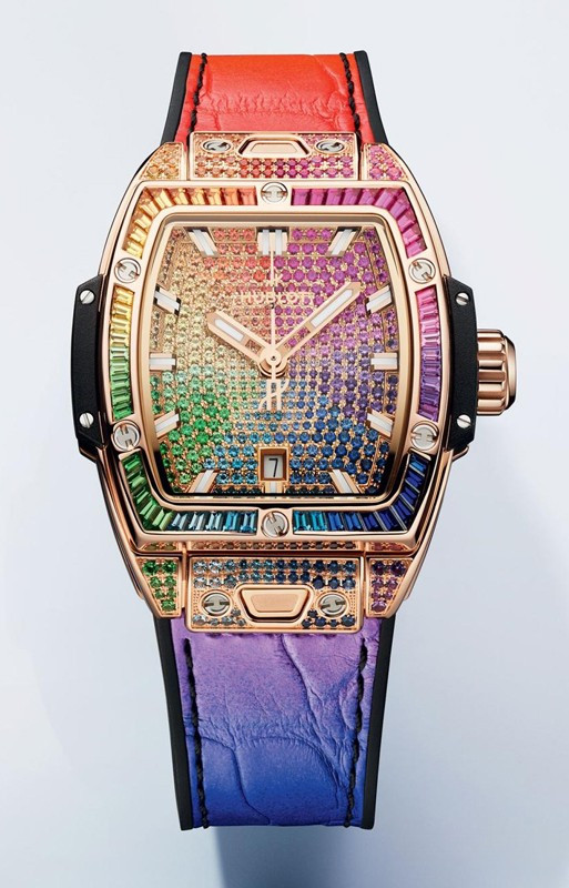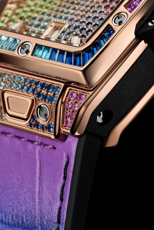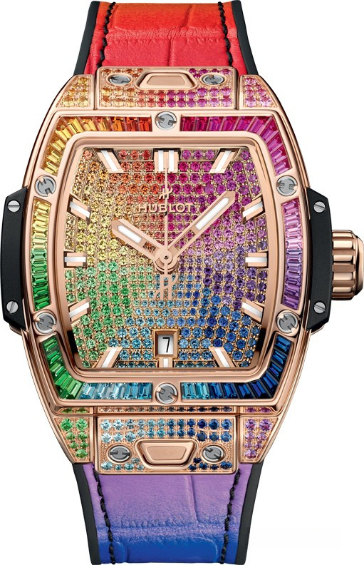 Часы Hublot Spirit of Big Bang 32 mm представлены в корпусе из розового золота 18к размером 32 мм и водонепроницаемостью до 100 метров. Внутри корпуса установлен автоматический механизм, Калибр HUB1120 с запасом хода 40 часов. На циферблате с разноцветными драгоценными камнями отображаются часы, минуты, секунды, дата. Часы комплектуются ремешком из кожи аллигатора с золотой застежкой. Корпус инкрустирован разноцветными драгоценными камнями.