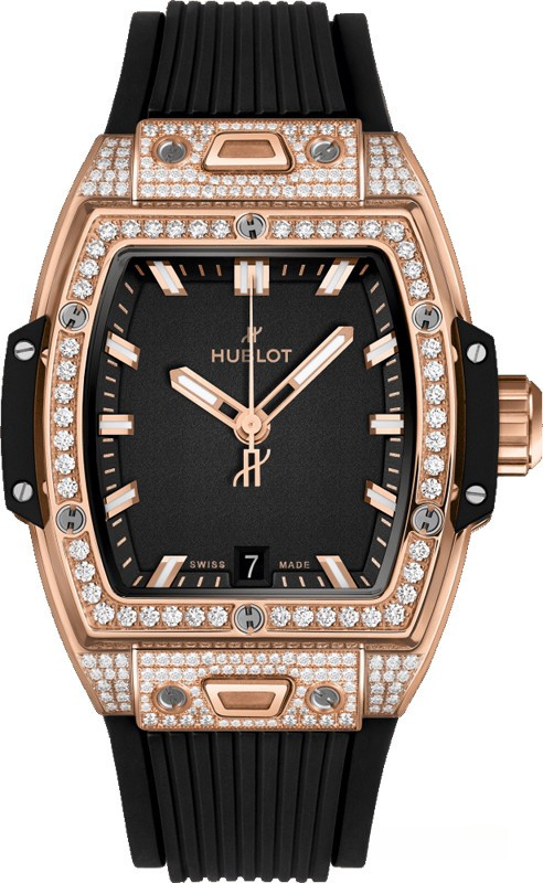 Часы Hublot Spirit of Big Bang 39 mm представлены в корпусе из розового золота 18к размером 39 мм и водонепроницаемостью до 100 метров. Внутри корпуса установлен автоматический механизм с запасом хода 50 часов. На черном циферблате отображаются часы, минуты, секунды, дата. Часы комплектуются каучуковым ремешком с золотой застежкой. Корпусинкрустирован белыми бриллиантами.
