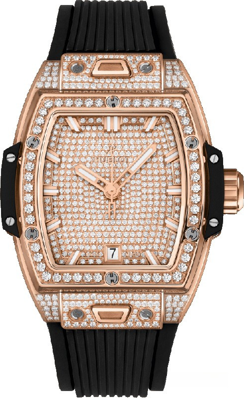 Часы Hublot Spirit of Big Bang 39 mm представлены в корпусе из розового золота 18к размером 39 мм и водонепроницаемостью до 100 метров. Внутри корпуса установлен автоматический механизм с запасом хода 50 часов. На циферблате с белыми бриллиантами отображаются часы, минуты, секунды, дата. Часы комплектуются каучуковым ремешком с золотой застежкой. Корпус инкрустирован белыми бриллиантами.