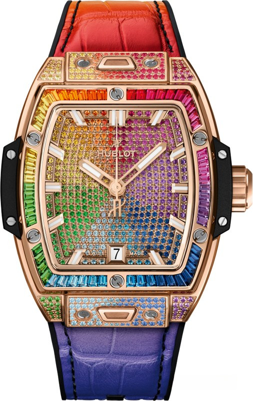 Часы Hublot Spirit of Big Bang 39 mm представлены в корпусе из розового золота 18к размером 39 мм и водонепроницаемостью до 100 метров. Внутри корпуса установлен автоматический механизм с запасом хода 50 часов. На циферблате с разноцветынми драгоценными камнями отображаются часы, минуты, секунды, дата. Часы комплектуются каучуковым ремешком с золотой застежкой. Корпус инкрустирован 164 цветными драгоценными камнями: рубины, розовые сапфиры, аметисты, синие сапфиры, синие топазы, цавориты, желтые и оранжевые сапфиры.