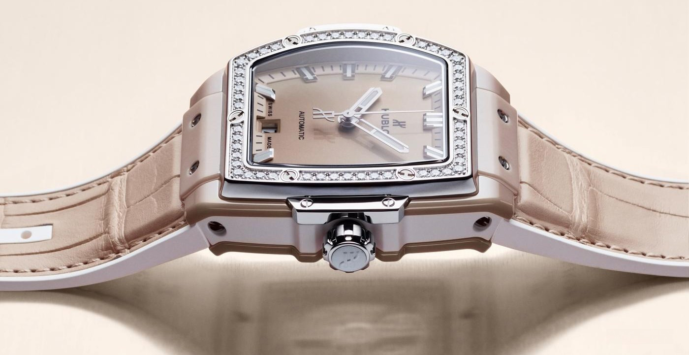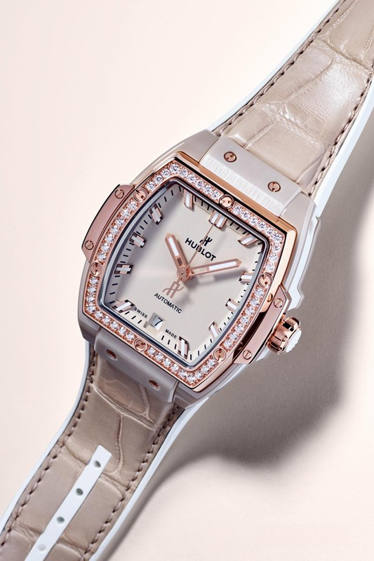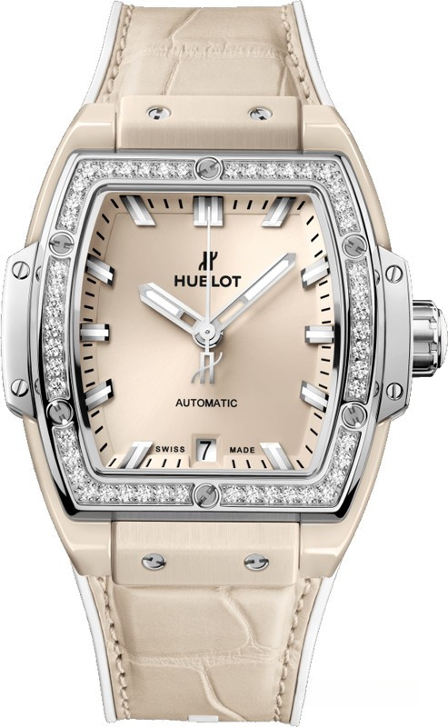 Часы Hublot Spirit of Big Bang 39 mm представлены в корпусе из керамики и титана размером 39 мм и водонепроницаемостью до 100 метров. Внутри корпуса установлен автоматический механизм с запасом хода 50 часов. На бежевом циферблате отображаются часы, минуты, секунды, дата. Часы комплектуются ремешком из каучука и кожи аллигатора с вставкой из нержавеющей стали. Безель из белых бриллиантов.