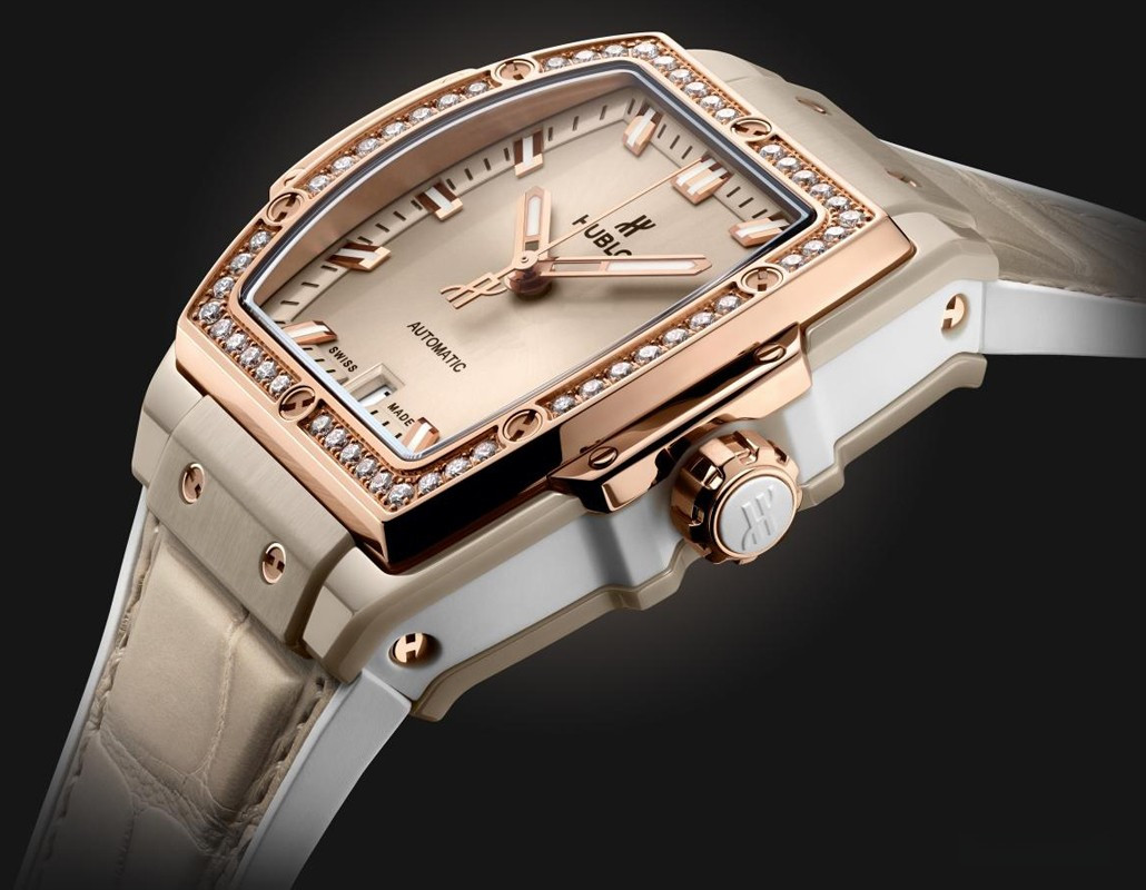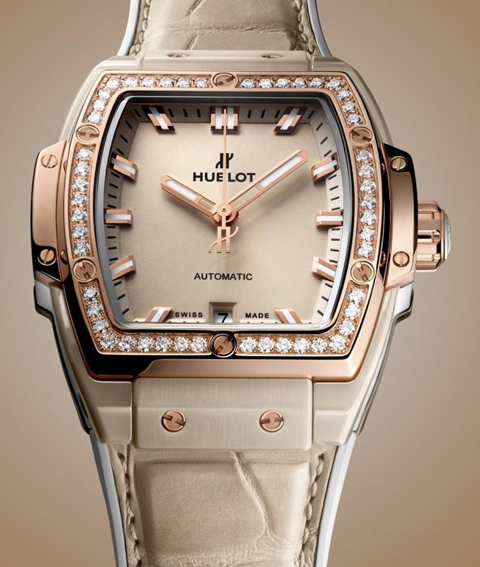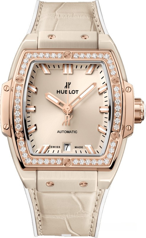 Часы Hublot Spirit of Big Bang 39 mm представлены в корпусе из керамики с безелем из розового золота 18к размером 39 мм и водонепроницаемостью до 100 метров. Внутри корпуса установлен автоматический механизм с запасом хода 50 часов. На бежевом циферблате отображаются часы, минуты, секунды, дата. Часы комплектуются ремешком из кожи аллигатора с вставкой из розового золота 18к. Безель из 50-ти белы бриллиантов общим весом 1 сt.