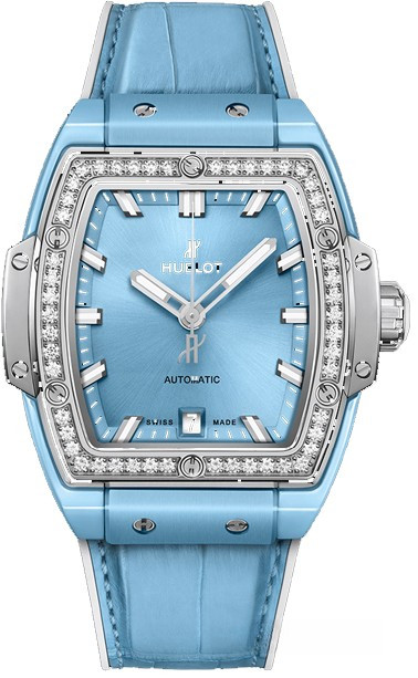 Часы Hublot Spirit of Big Bang Light Blue Ceramic Titanium Diamonds 39 mm представлены в корпусе из титана и керамики размером 39 мм и водонепроницаемостью 100 метров. Внутри корпуса установлен автоматический механизм, Калибр HUB1710, обладающий запасом хода 50 часов. На голубом циферблате отображаются часы, минуты, секунды, дата. Часы поставляются на ремешке из кожи аллигатора с вставкой из титана. Безель из белых бриллиантов.