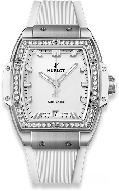 Часы Hublot Spirit of Big Bang Titanium Diamonds 39 mm представлены в корпусе из титана размером 39 мм и водонепроницаемостью до 100 метров. Внутри корпуса установлен автоматический механизм с запасом хода 50 часов. На белом циферблате отображаются часы, минуты, секунды, дата. Часы комплектуются каучуковым ремешком с вставкой из нержавеющей стали. Безель из 50-ти белых бриллиантов.