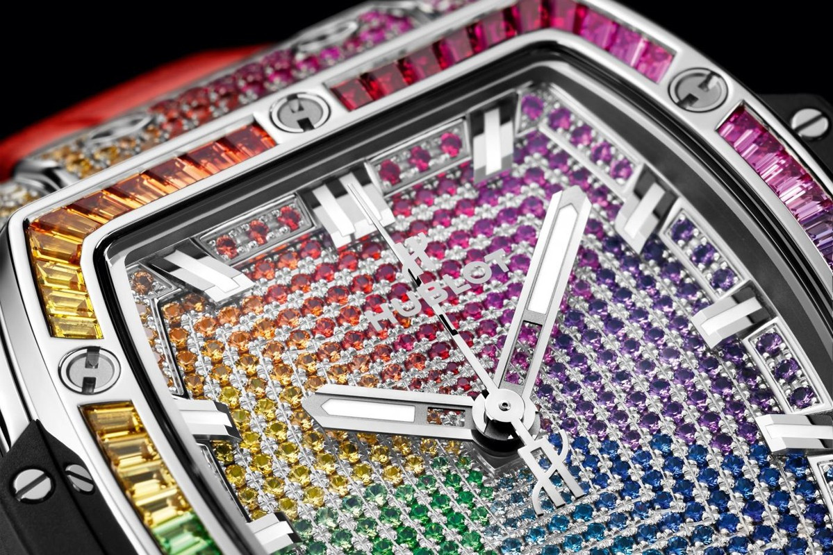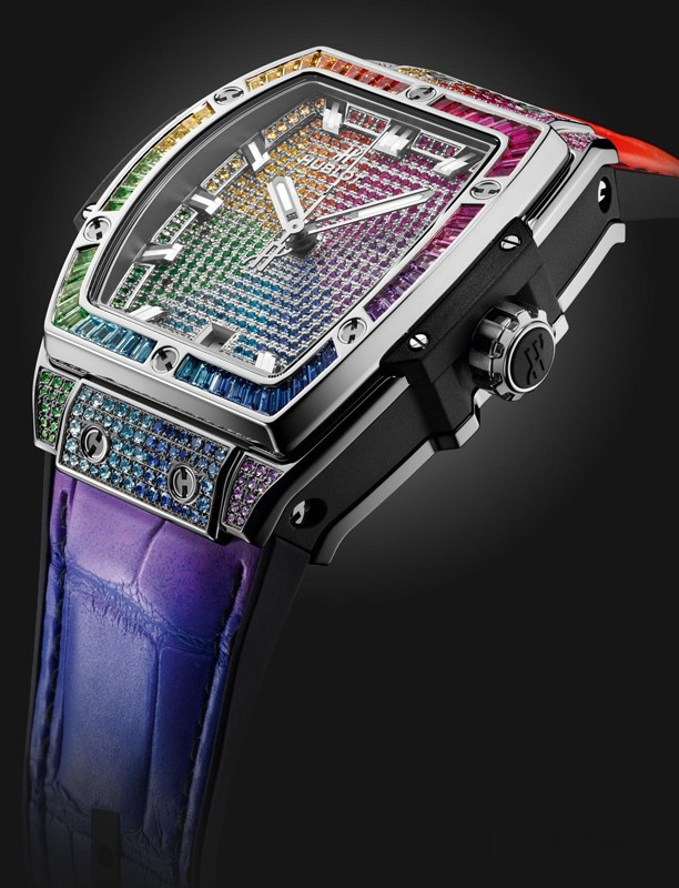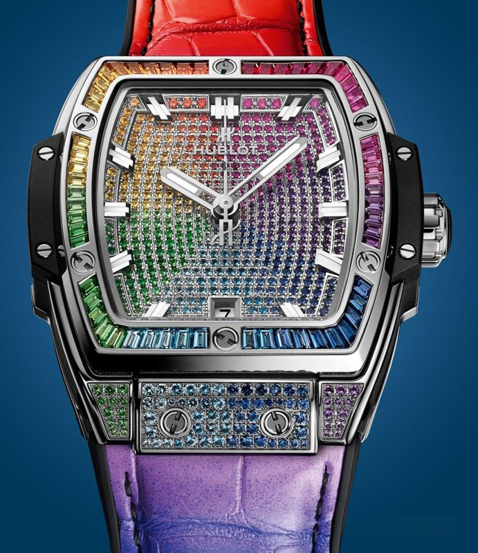 Часы Hublot Spirit of Big Bang 39 mm представлены в корпусе из титана с безелем из белого золота 18к размером 39 мм и водонепроницаемостью до 100 метров. Внутри корпуса установлен автоматический механизм с запасом хода 50 часов. На циферблате с разноцветными драгоценными камнями отображаются часы, минуты, секунды, дата. Часы комплектуются ремешком из кожи аллигатора с вставкой из титана. Безель - 62 цветных драгоценных камня багетной огранки: рубины, розовые сапфиры, аметисты, синие сапфиры, синие топазы, цавориты, желтые и оранжевые сапфиры, корпус - 164 камня: рубины, розовые сапфиры, аметисты, синие сапфиры, синие топазы, цавориты, желтые и оранжевые сапфиры.