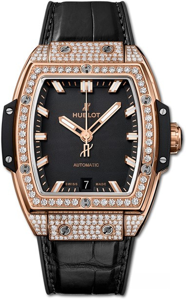 Часы Hublot Spirit of Big Bang King Gold Pave 39 mm представлены в корпусе из розового золота 18к размером 39 мм и водонепроницаемостью 100 м. Внутри корпуса установлен автоматический механизм, Калибр HUB1710, обладающий запасом хода 50 часов. На черном циферблате отображаются часы, минуты, секунды и дата. Часы комплектуются ремешком из кожи аллигатора с вставкой из розового золота 18к. Корпус инкрустирован белыми бриллиантами.