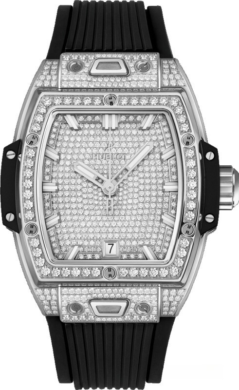Часы Hublot Spirit of Big Bang 39 mm представлены в корпусе из титана размером 39 мм и водонепроницаемостью до 100 метров. Внутри корпуса установлен автоматический механизм с запасом хода 50 часов. На циферблате из белых бриллиантов отображаются часы, минуты, секунды, дата. Часы комплектуются каучуковым ремешком с титановой застежкой. Корпус инкрустирован белыми бриллиантами.