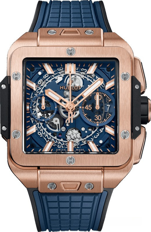 Часы Hublot Square Bang Unico 42 mm представлены в корпусе размером 42 мм из розового золота 18к водонепроницаемостью 100 метров. Внутри корпуса установлен автоматический механизм, Калибр HUB1280, обладающий запасом хода 42 часа. На синем циферблате отображаются часы, минуты, секунды, дата, накопители хронографа. Часы поставляются на каучуковом ремешке с золотой застежкой.