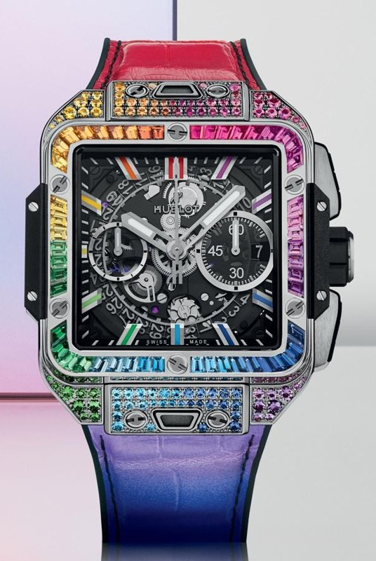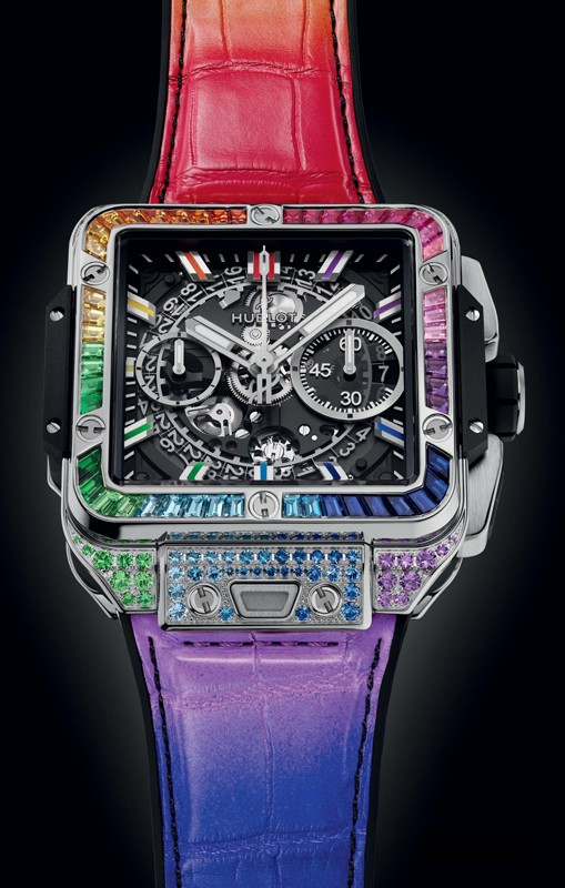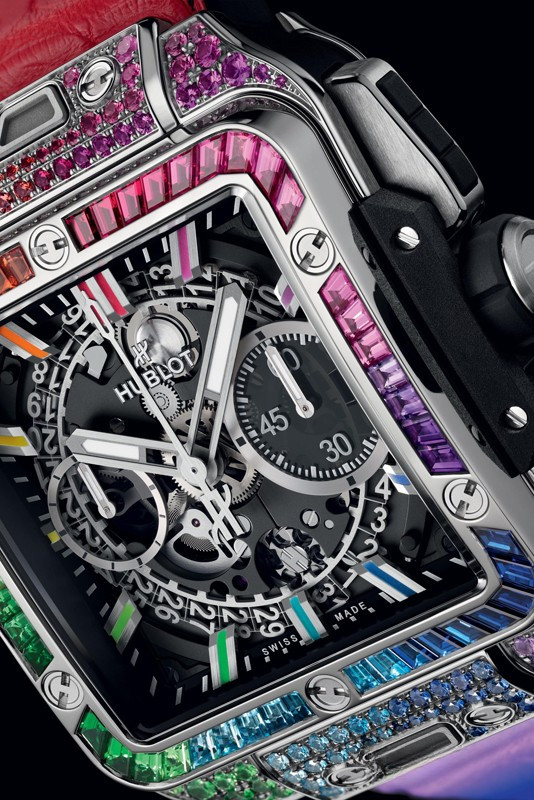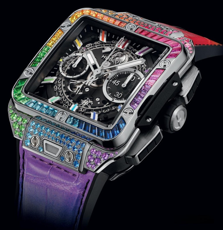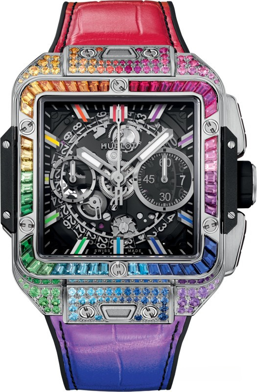 Часы Hublot Square Bang Unico 42 mm представлены в корпусе размером 42 мм из титана водонепроницаемостью 100 метров. Внутри корпуса установлен автоматический механизм, Калибр HUB1280, обладающий запасом хода 42 часа. На черном циферблате отображаются часы, минуты, секунды, дата, накопители хронографа. Часы поставляются на ремешке из кожи аллигатора с титановой застежкой. Корпус инкрустирован разноцветными драгоценными камнями.