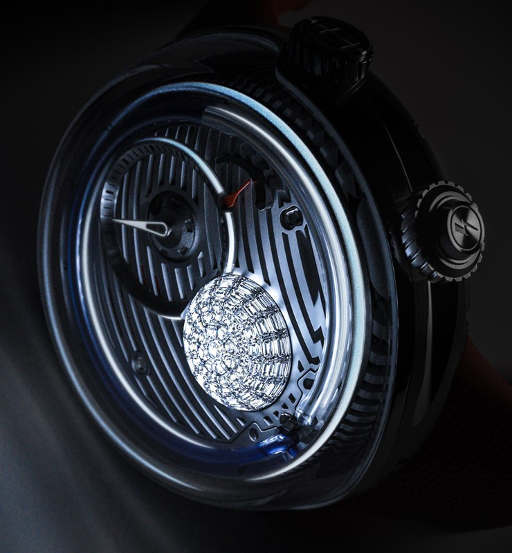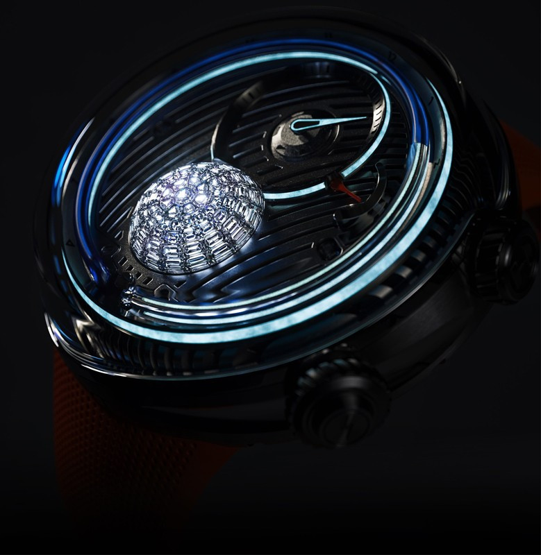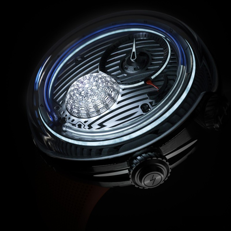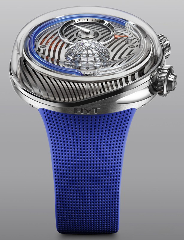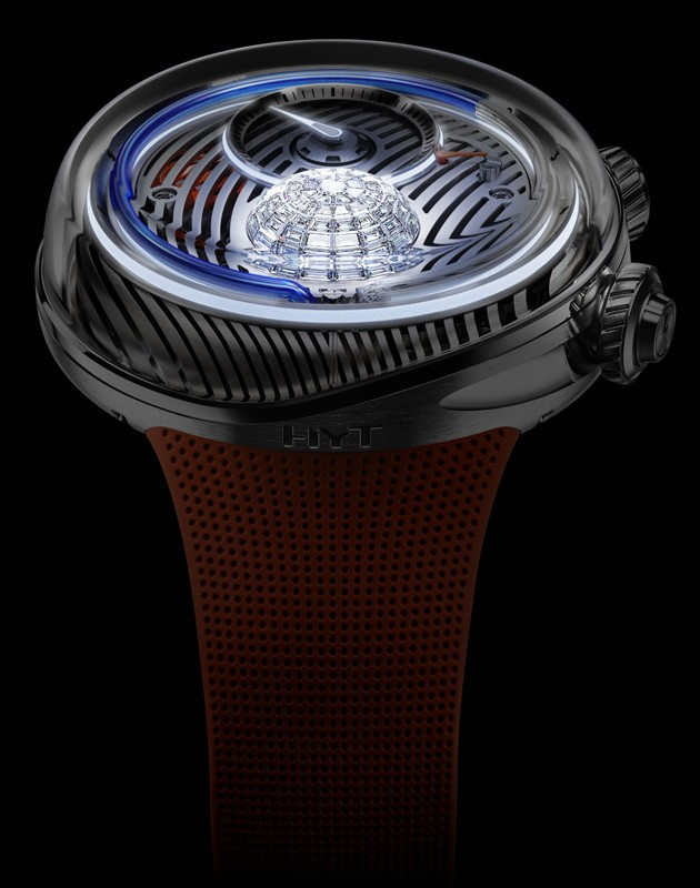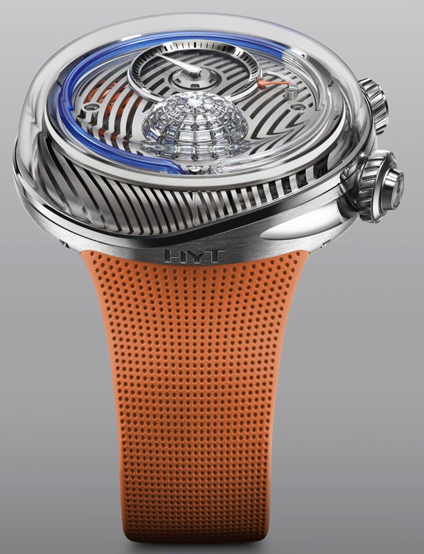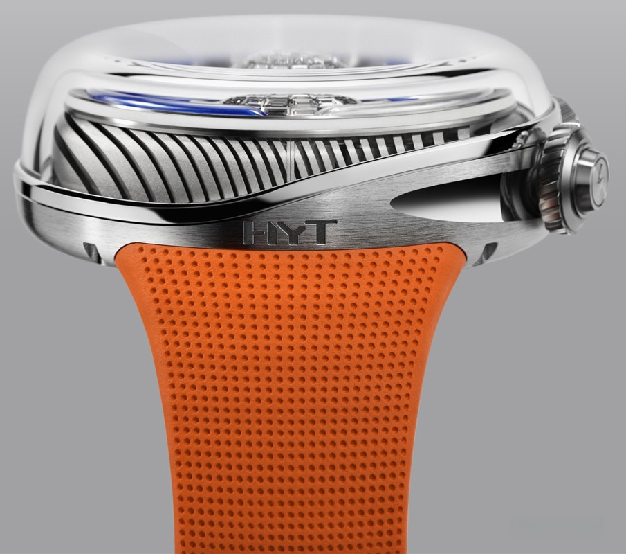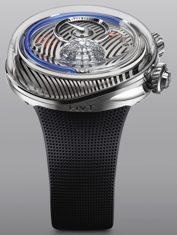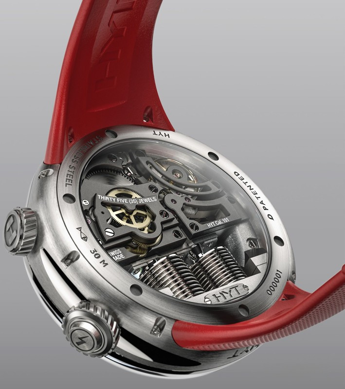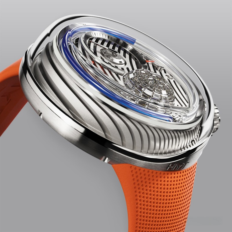 Часы HYT Flow Fluid представлены в корпусе из нержавеющей стали размером 51 х 20.6 мм водонепроницаемостью 30 метров. Внутри корпуса установлен механизм с ручным заводом, обладающий запасом хода 65 часов. На серебристом скелетированном циферблате с белыми бриллиантами отображаются часы, минуты, секунды, запас хода. Часы поставляются на каучуковом ремешке с титановой вставкой. Серия ограничена - 25 шт.