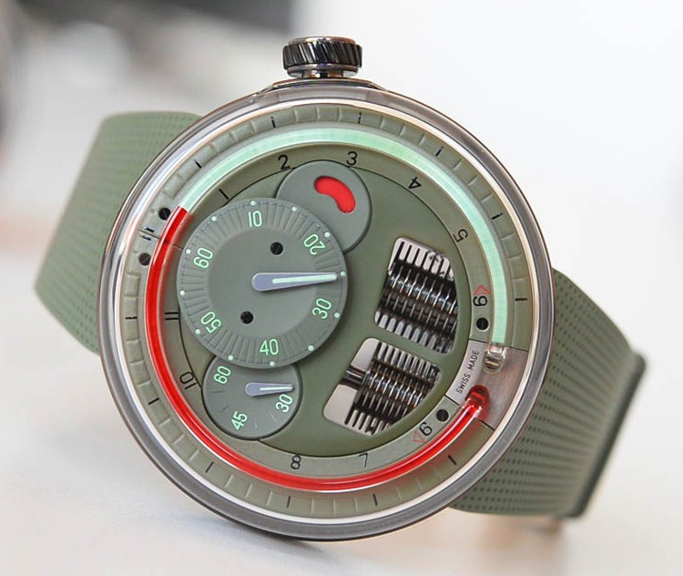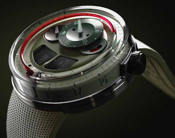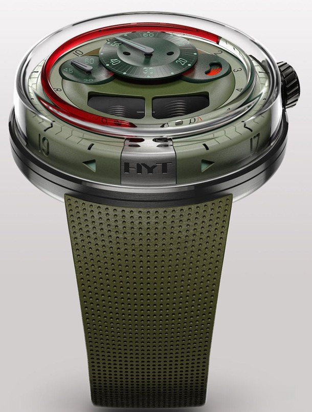 Часы Hyt H0 представлены в корпусе размером 48.8 х 18.7 мм из нержавеющей стали с серым покрытием DLC и водонепроницаемостью до 30 метров. Внутри корпуса установлен механизм с ручным заводом и 65-часовым запасом хода. На зеленом циферблате отображаются часы, минуты, секунды, запас хода. Часы поставляются на каучуковом ремешке с титановой вставкой.