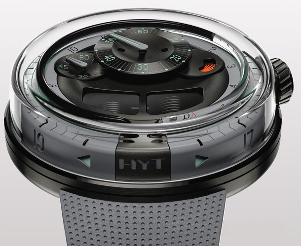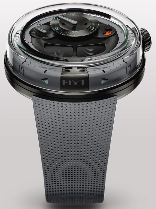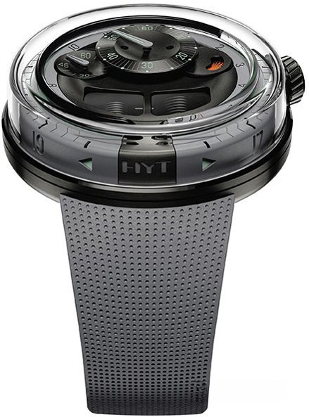 Часы Hyt H0 представлены в корпусе размером 48.8 х 18.7 мм из нержавеющей стали с черным покрытием DLC и водонепроницаемостью до 30 метров. Внутри корпуса установлен механизм с ручным заводом и 65-часовым запасом хода. На черном циферблате отображаются часы, минуты, секунды, запас хода. Часы поставляются на каучуковом ремешке с титановой вставкой.