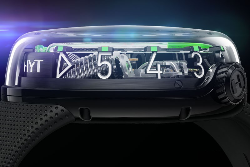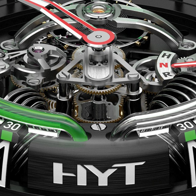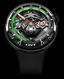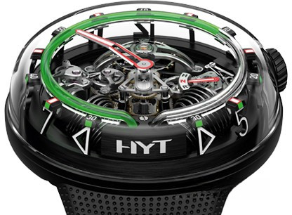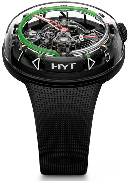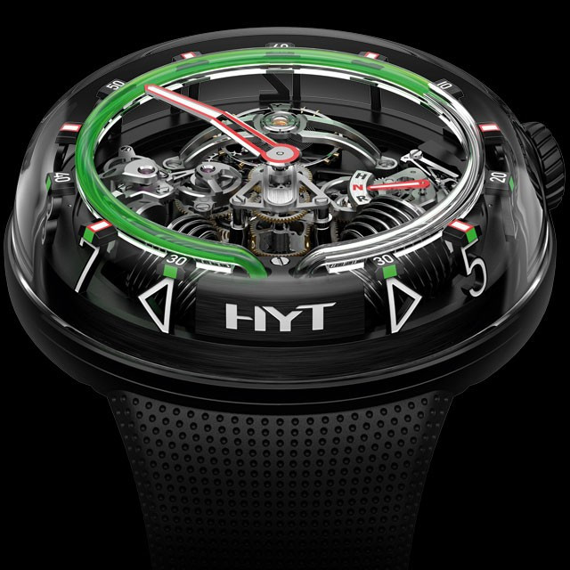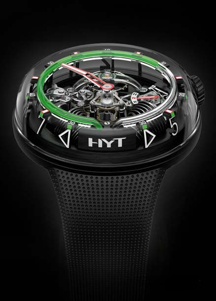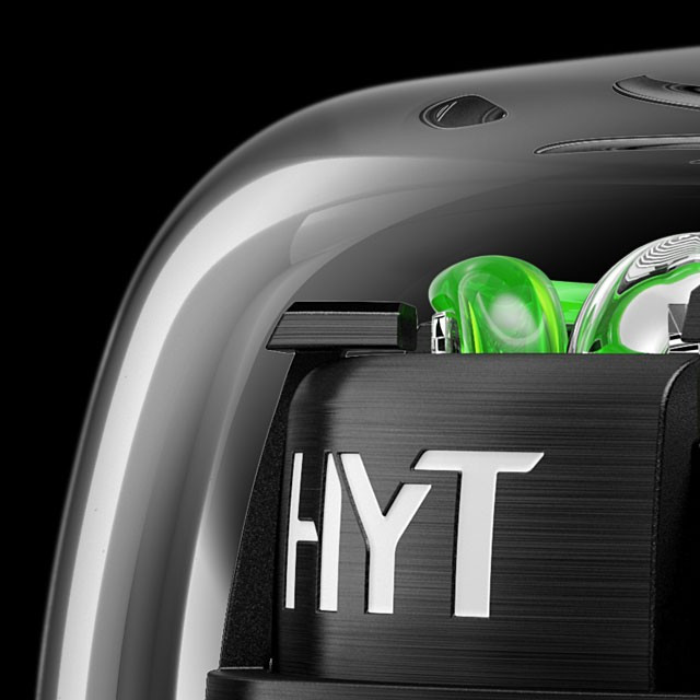 Часы Hyt H2O представлены в корпусе размером 51 х 19.95 мм из нержавеющей стали с черным покрытием DLC и водонепроницаемостью до 30 метров. Внутри корпуса установлен механизм с ручным заводом и запасом хода 8 дней. На черном циферблате отображаются часы, минуты, запас хода, термальный индикатор. Часы поставляются на каучуковом ремешке с титановой вставкой. Серия ограничена - 25 шт.