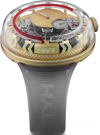 Часы Hyt H2O представлены в корпусе размером 51 х 19.95 мм из желтого золота 18к водонепроницаемостью до 30 метров. Внутри корпуса установлен механизм с ручным заводом и запасом хода 8 дней. На золотистом циферблате отображаются часы, минуты, запас хода, термальный индикатор. Часы поставляются на каучуковом ремешке с золотой вставкой. Серия ограничена - 20 шт.