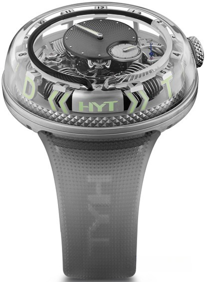 Часы Hyt H2O представлены в корпусе размером 51 х 19.95 мм из нержавеющей стали водонепроницаемостью до 30 метров. Внутри корпуса установлен механизм с ручным заводом и запасом хода 8 дней. На черном гильошированном циферблате отображаются часы, минуты, запас хода, термальный индикатор. Часы поставляются на каучуковом ремешке со стальной вставкой. Серия ограничена - 20 шт.
