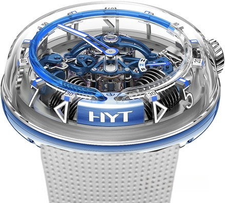 Часы Hyt H2O представлены в корпусе размером 51 х 19.95 мм из нержавеющей стали водонепроницаемостью до 30 метров. Внутри корпуса установлен механизм с ручным заводом и запасом хода 8 дней. На сером циферблате отображаются часы, минуты, запас хода, термальный индикатор. Часы поставляются на каучуковом ремешке со стальной вставкой. Серия ограничена - 10 шт.