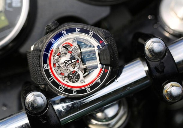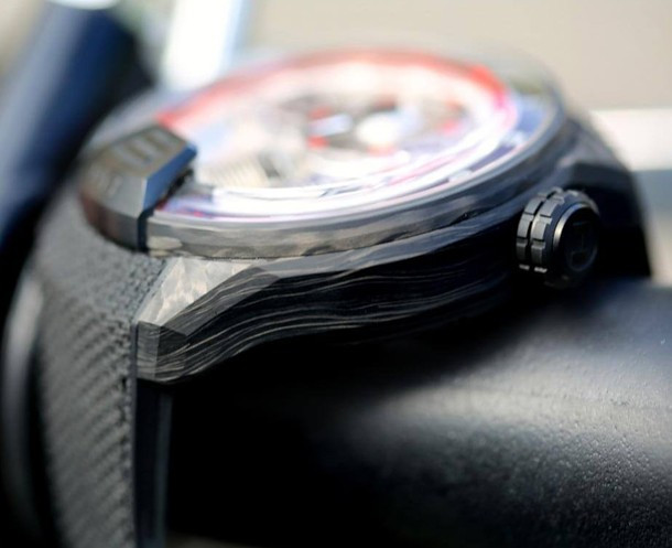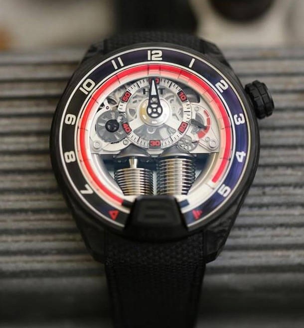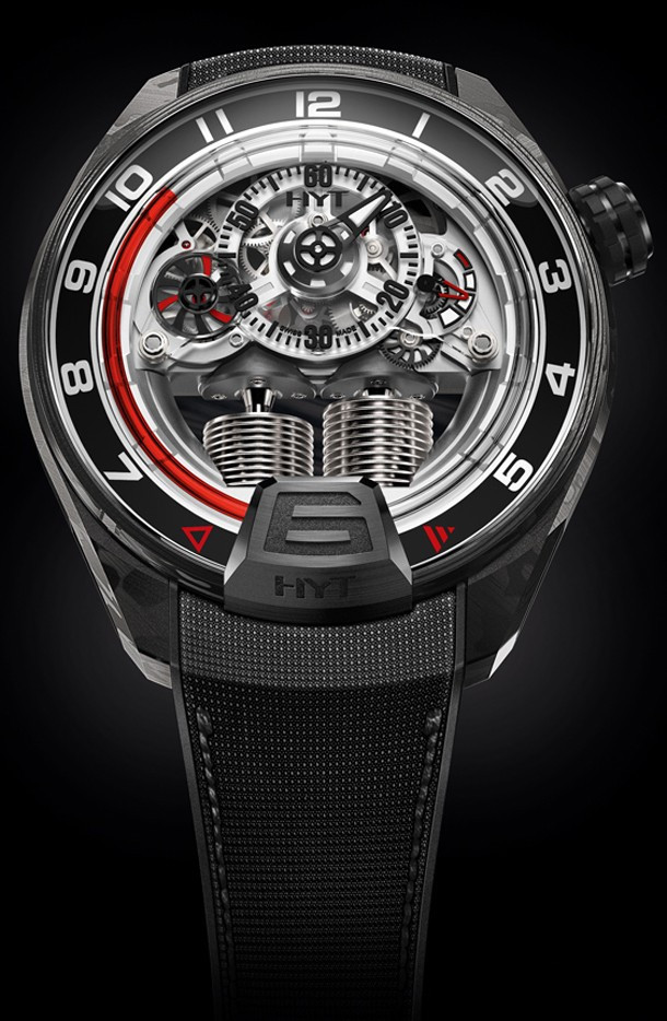 Корпус часов изготовлен из углерода 3DTPTM, 51 мм в диаметре, 17.9 мм в толщину, титановая DLC заводная головка, помещенная в каучук, выпуклое сапфировое стекло с внутренним антибликовым покрытием, привинченная сапфировая задняя часть корпуса, водонепроницаемость до 50 матров. Часовой механизм скелетонизированный эксклюзивный от HYT механический калибр с ручным заводом; частота работы 28 800 пк/час, 4 Гц, 35 камней, мосты с вручную снятой фаской и украшены узорами Côtes de Genève, родиевые воздуходувные цилиндры, запас хода в 65 часов. Ремешок: основа из черного каучука со встроенными волокнами NomexTM, и складная застежка из черного DLC титана
