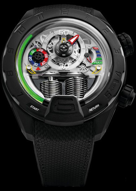 Часы HYT H4 Panis Barthez Competition представлены в корпусе из титана с черным покрытием DLC диаметром 51 мм и водонепроницаемостью 50 метров. Внутри корпуса установлен механизм с ручным заводом. На серебристом циферблате отображаются часы, минуты, секунды и запас хода. Часы комплектуются текстильным ремешком с титановой вставкой.