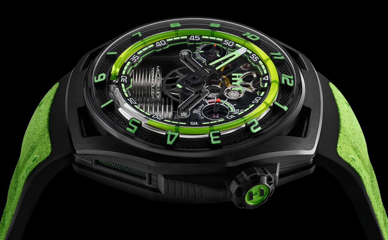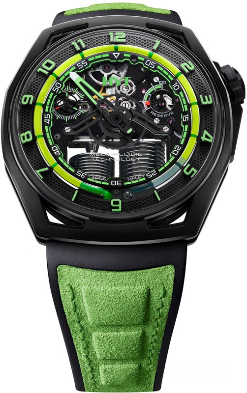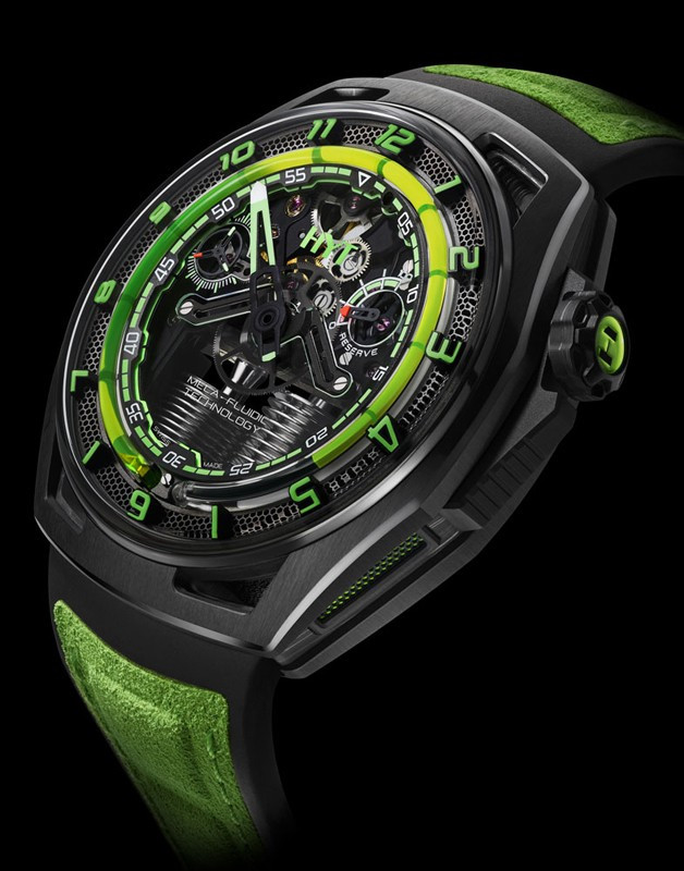 Часы HYT Hastroid Green Nebula представлены в корпусе размером 48 х 52.3 х 17.2 мм из титана с покрытием DLC и карбона водонепроницаемостью 50 метров. Внутр корпуса установлен механизм с ручным заводом, Калибр 501-CM, обладающий запасом хода 72 часа. На черном скелетированном циферблате отображаются часы, минуты, секунды, запас хода. Часы поставляются на каучуковом ремешке с титановой застежкой. Серия ограничена - 27 шт.