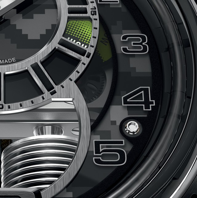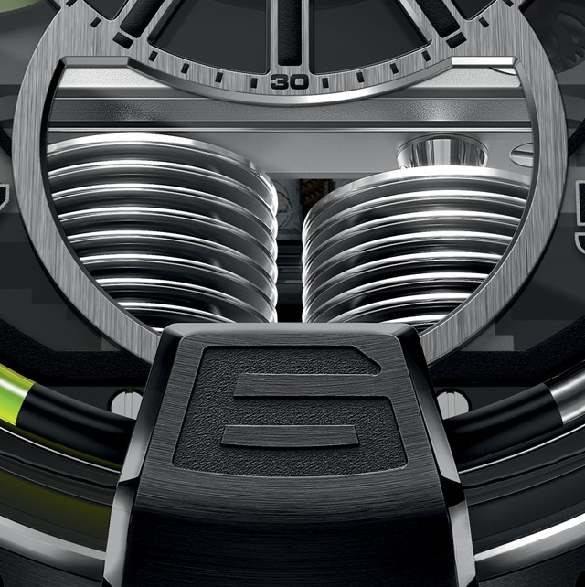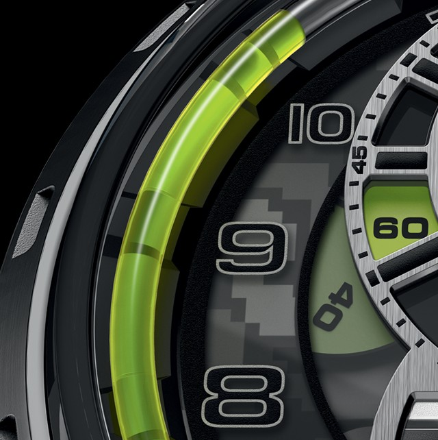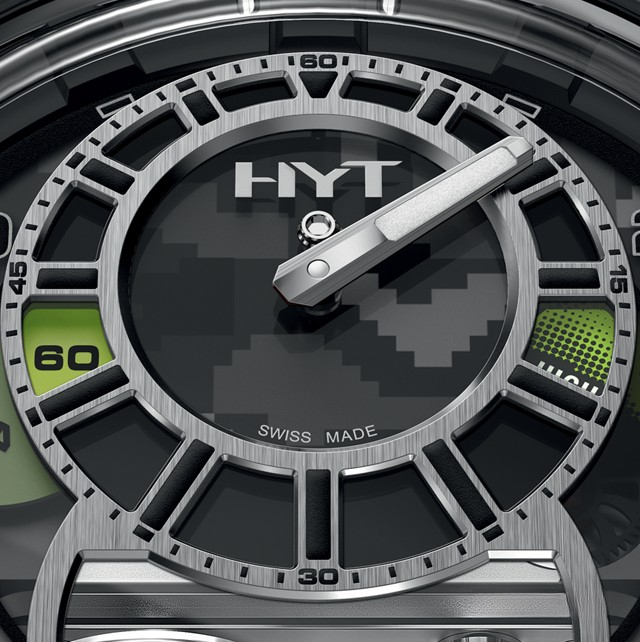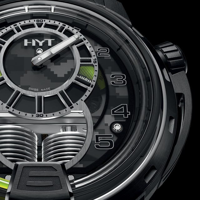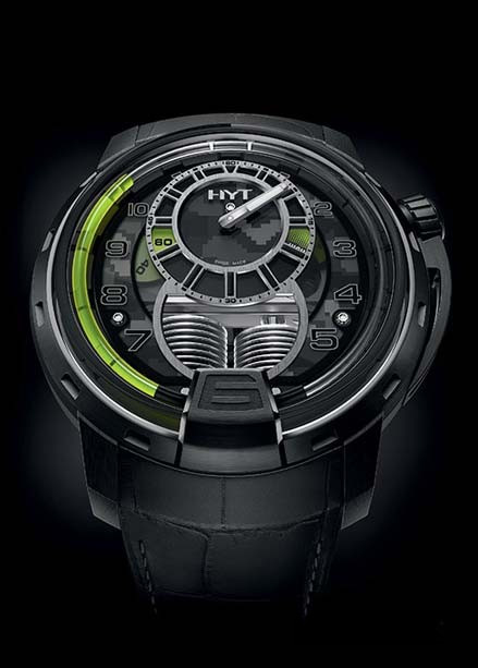 Часы HYT H1 представлены в корпусе размером 48.8 х 17.9 мм из титана с покрытием DLC и водонепроницаемостью до 100 метров. Внутри корпуса установлен механизм с ручным заводом, обладающий запасом хода 65 часов. На черном циферблате отображаются часы, минуты, секунды, запас хода. Часы поставляются на ремешке из кожи аллигатора с титановой вставкой. Серия ограничена 25 шт.