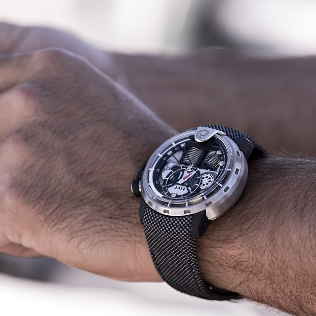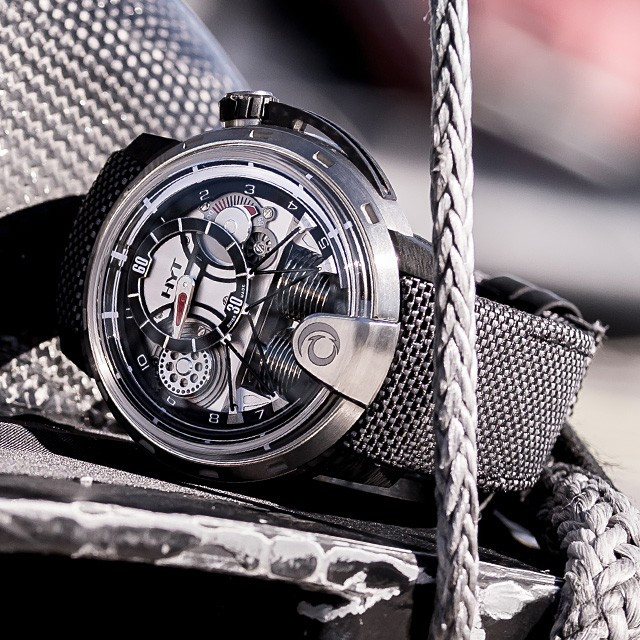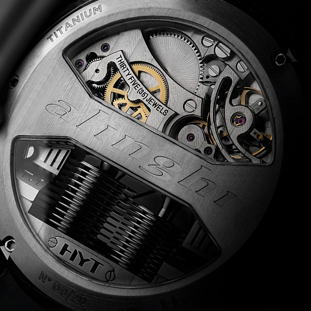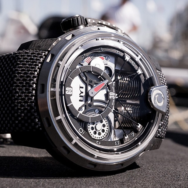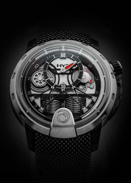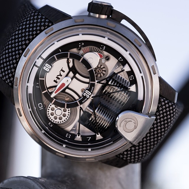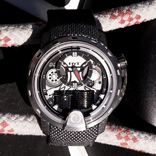 Часы HYT H1 представлены в корпусе размером 48.8 х 17.9 мм из титана и карбона с водонепроницаемостью до 30 метров. Внутри корпуса установлен механизм с ручным заводом, обладающий запасом хода 65 часов. На серебристом циферблате отображаются часы, минуты, секунды, запас хода. Часы поставляются на текстильном ремешке с титановой вставкой. Серия ограничена 20 шт.