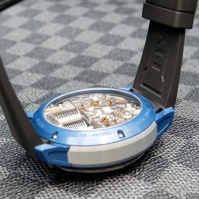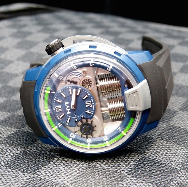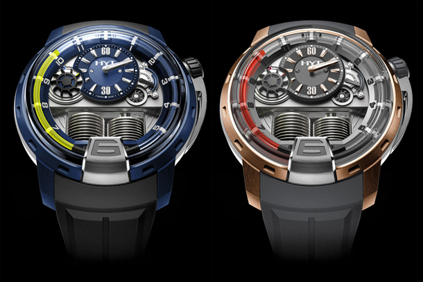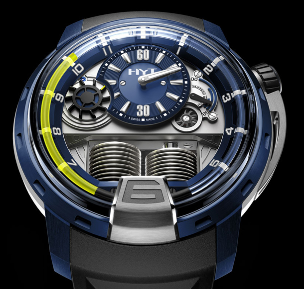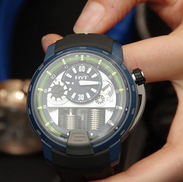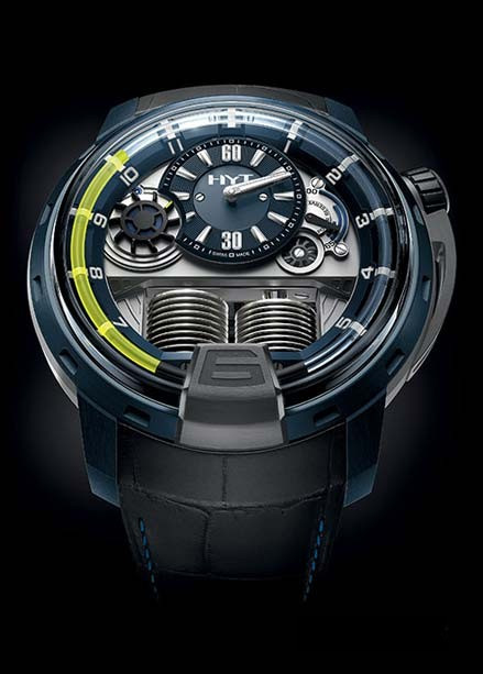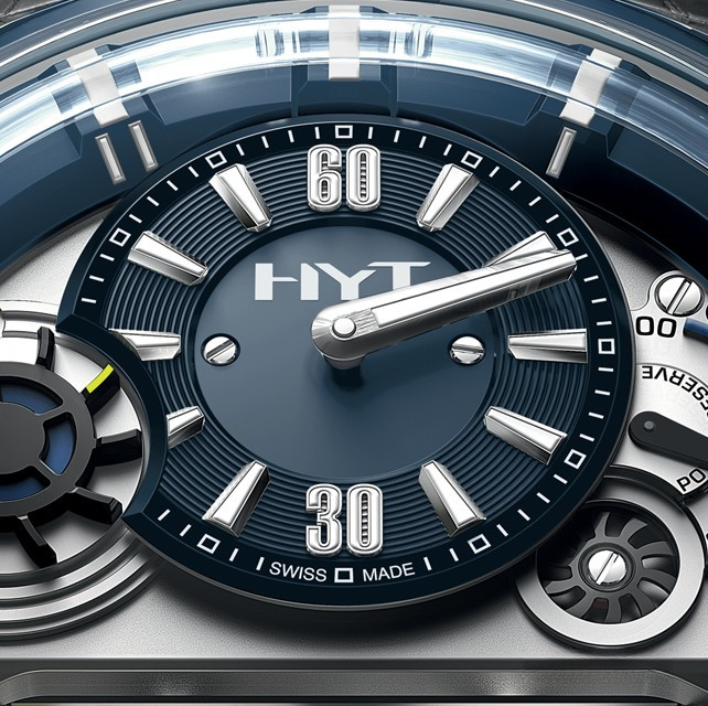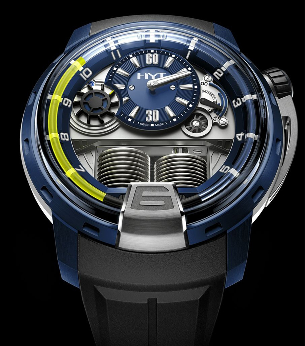 Часы HYT H1 представлены в корпусе размером 48.8 х 17.9 мм из алюминиевого сплава ALUN 316B с водонепроницаемостью до 100 метров. Внутри корпуса установлен механизм с ручным заводом, обладающий запасом хода 65 часов. На сером циферблате отображаются часы, минуты, секунды, запас хода. Часы поставляются на каучуковом ремешке с титановой вставкой.