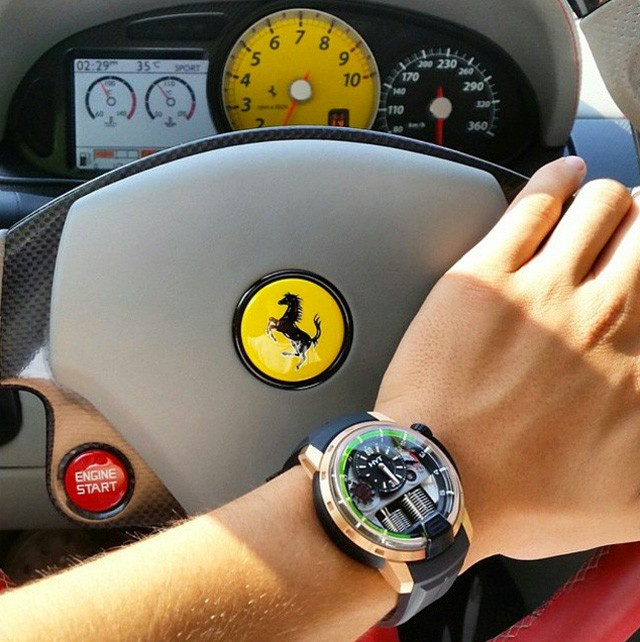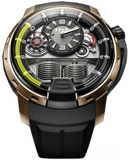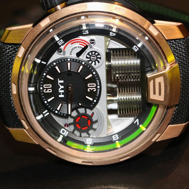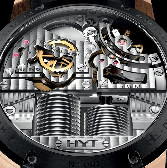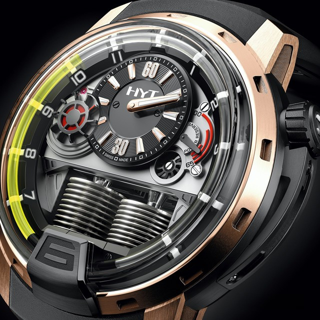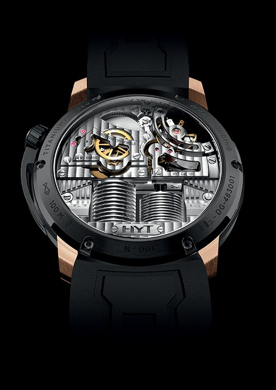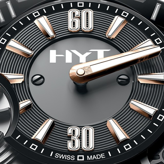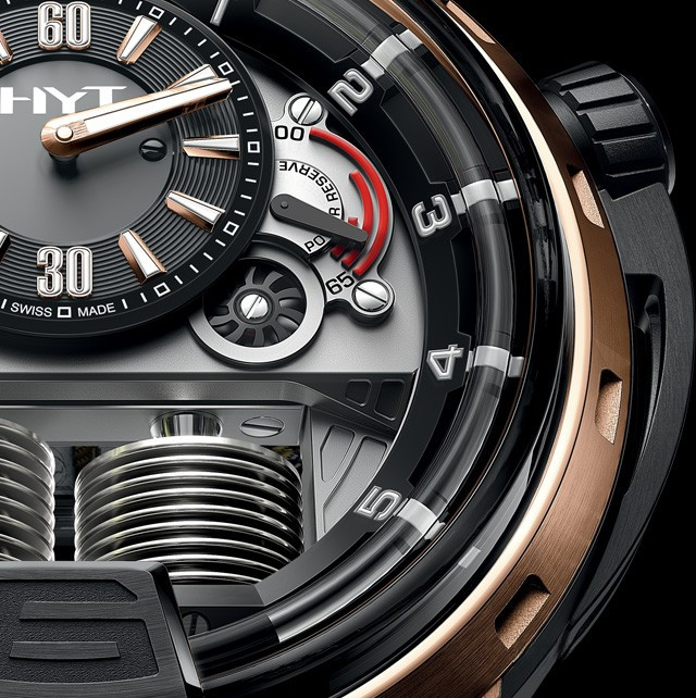 Часы HYT H1 представлены в корпусе размером 48.8 х 17.9 мм из титана с черным покрытием DLC и розового золота 18к с водонепроницаемостью до 100 метров. Внутри корпуса установлен механизм с ручным заводом, обладающий запасом хода 65 часов. На черном циферблате отображаются часы, минуты, секунды, запас хода. Часы поставляются на каучуковом ремешке с титановой вставкой.