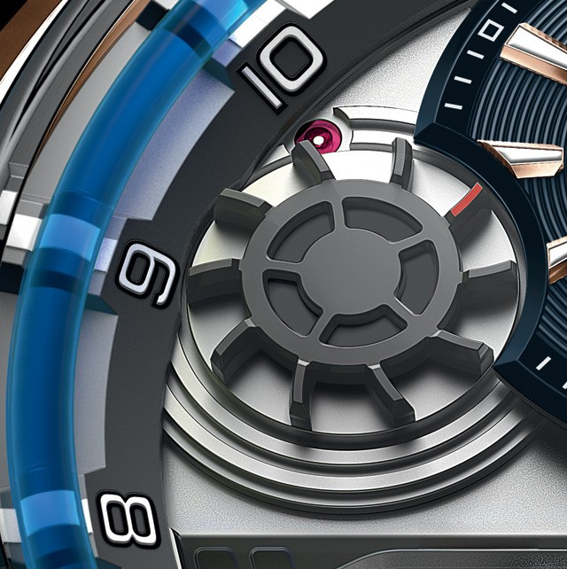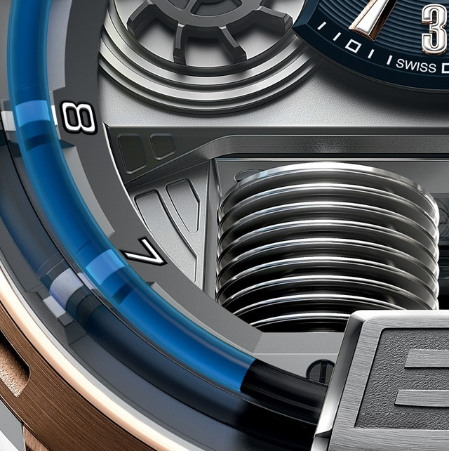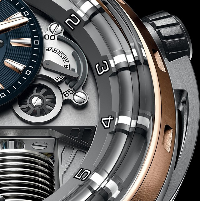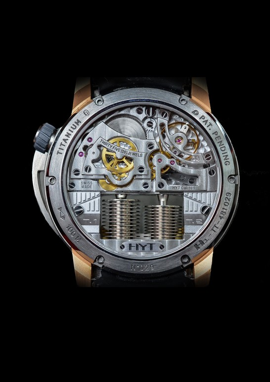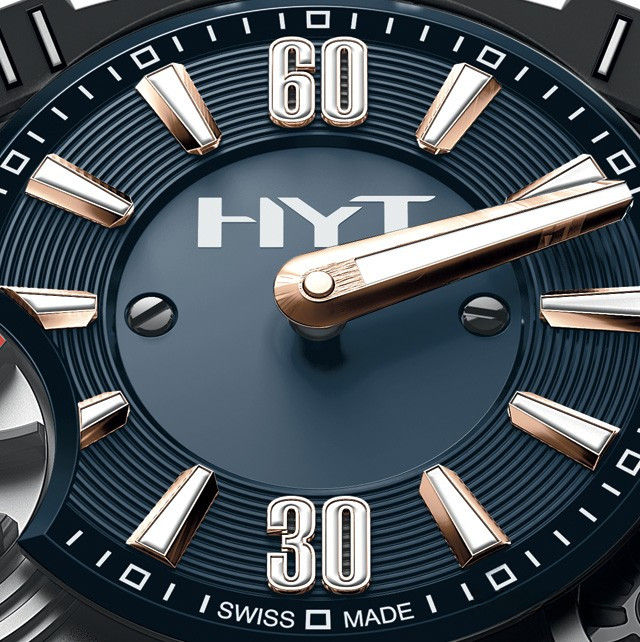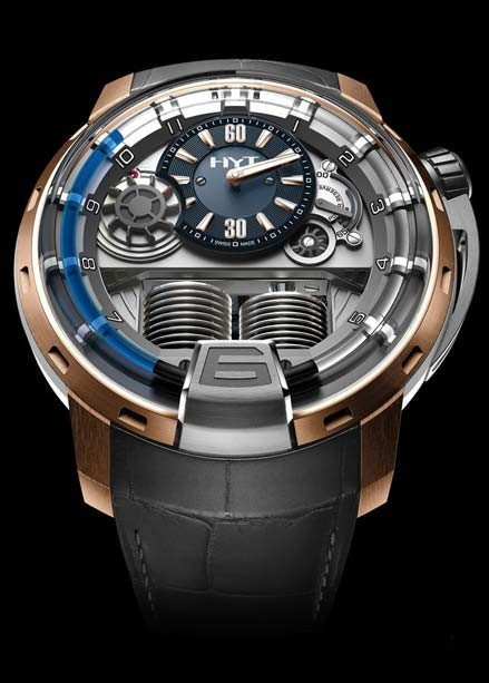 Часы HYT H1 представлены в корпусе размером 48.8 х 17.9 мм из титана и розового золота 18к с водонепроницаемостью до 100 метров. Внутри корпуса установлен механизм с ручным заводом, обладающий запасом хода 65 часов. На сером циферблате отображаются часы, минуты, секунды, запас хода. Часы поставляются на ремешке из кожи аллигатора с титановой вставкой.