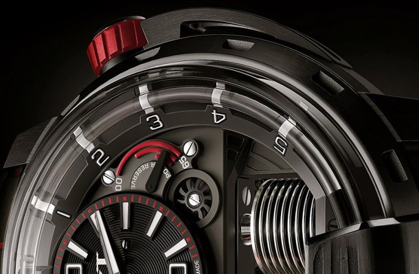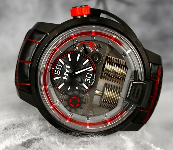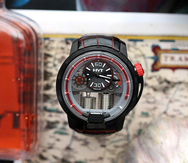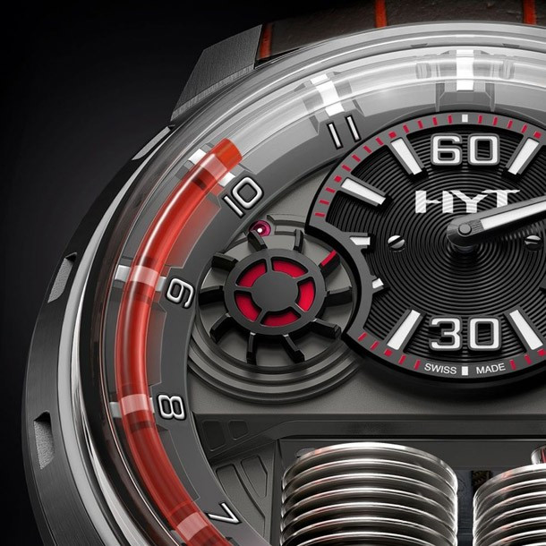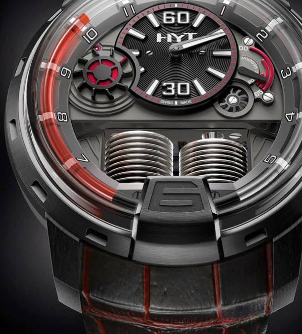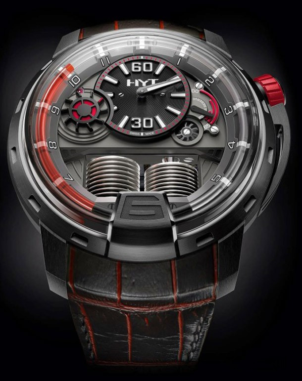 У модели круглый корпус диаметром 48,8 мм и толщиной 17,9 мм из титана с черным матовым DLC покрытием. Водонепроницаемость – 100 метров. Размещенная у метки 2 завинчивающаяся заводная головка оснащена резиновой накладкой красного цвета. Многоуровневый циферблат, закрытый выпуклым сапфировым стеклом с антибликовым покрытием, оснащен дополнительным циферблатом с арабскими цифрами и одной стрелкой, посредством которой осуществляется индикация минут. Индикация часов осуществляется посредством изменения уровня люминесцентной жидкости красного цвета, которая находится в круглой трубочке на 6 часах. Круглый указатель между меток 9 и 10 предусмотрен для индикации секунд, а аналоговый указатель между меток 2 и 3 – для индикации запаса хода. Новинка H1 Dracula DLC собрана на базе калибра HYT 101 с ручным заводом, на 35 камнях, с частотой 28 800 полуколебаний в час и 65-часовым запасом хода. Поставляется модель на черном ремешке из кожи аллигатора с красной прошивкой и с застежкой из титана с черным DLC-покрытием. В комплект поставки входит также резиновый ремешок черного цвета. Выпуск часов ограничен - 50 экземпляров.