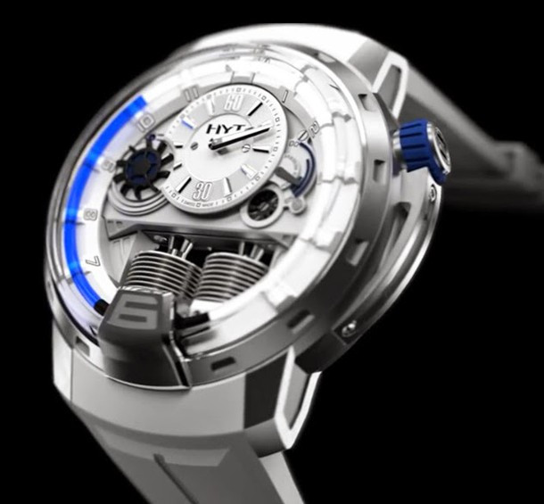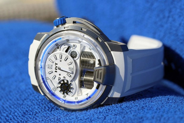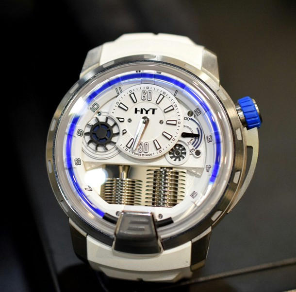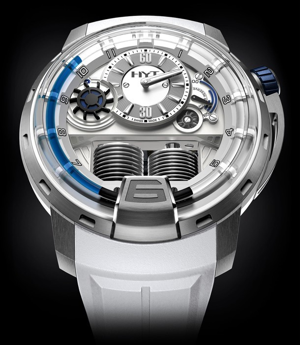 Часы HYT H1 Iceberg Blue & White выпущены в титановом корпусе размером 48.8 х 17.9 мм и водонепроницаемостью до 100 метров. Циферблат часов покрыт сапфировым стеклом с антибликовым покрытием. На циферблате расположена ретроградная часовая шкала с синей жидкостью, а также индикация минут, секунд и запаса хода. Эксклюзивный часовой механизм с ручным заводом HYT обладает балансовой частотой 28 800 пк/час, 4 Гц, 35 драгоценных камней. Мосты отделаны вручную: снятие фасок, украшенные с помощью техники Женевских полос, покрытые родием сильфоны. Запаса хода составляет 65 часов. Часы комплектуются белым каучуковым ремешком, а также дополнительным черным из кожи аллигатора с с титановой стандартной застежкой.
