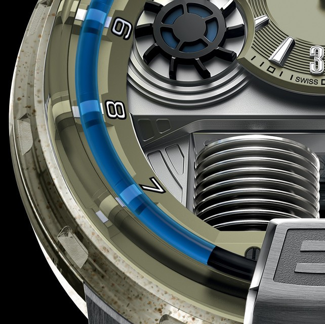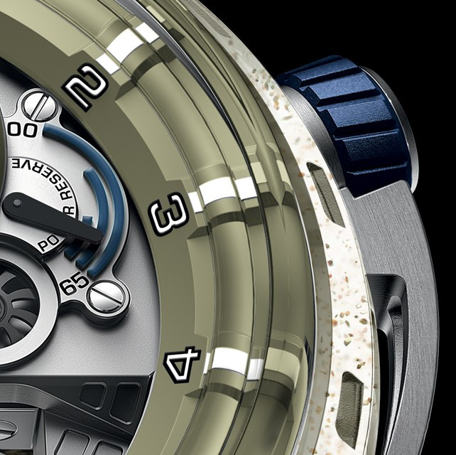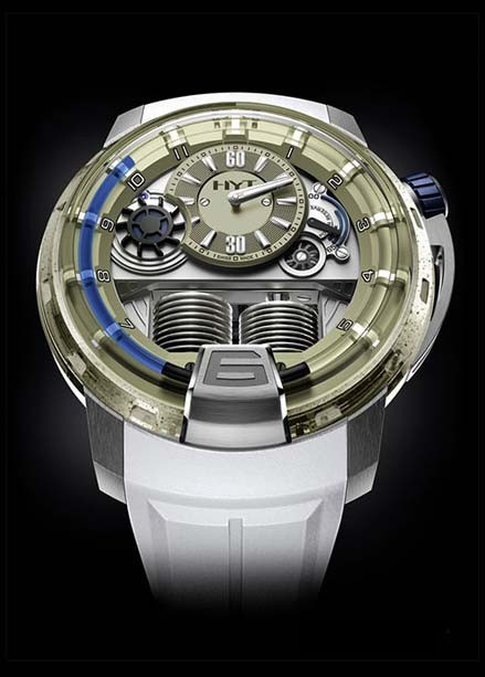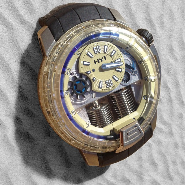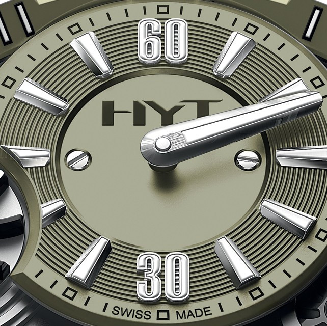 Часы HYT H1 представлены в корпусе размером 48.8 х 17.9 мм из полиэпоксида с водонепроницаемостью до 30 метров. Внутри корпуса установлен механизм с ручным заводом, обладающий запасом хода 65 часов. На сером циферблате отображаются часы, минуты, секунды, запас хода. Часы поставляются на каучуковом ремешке с титановой вставкой. Серия ограничена 25 шт.