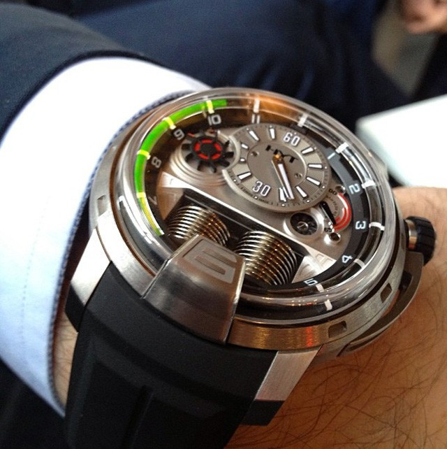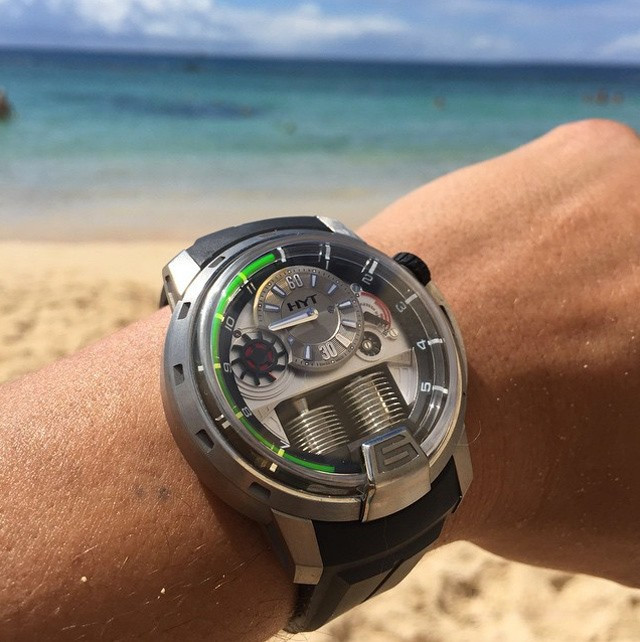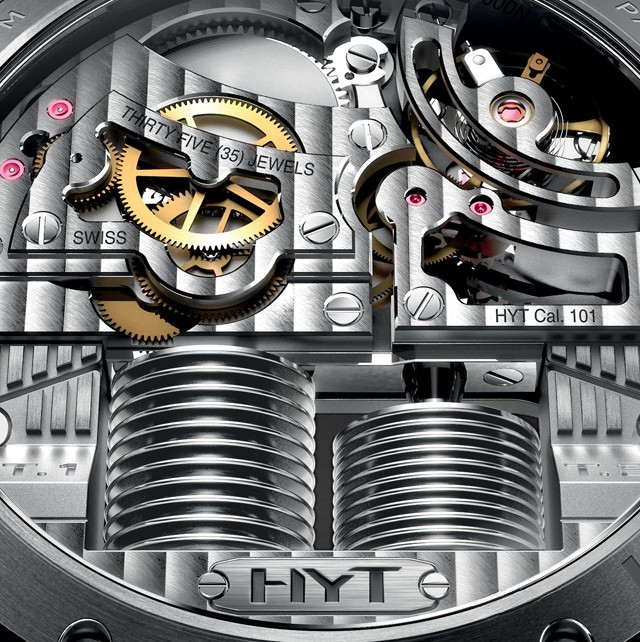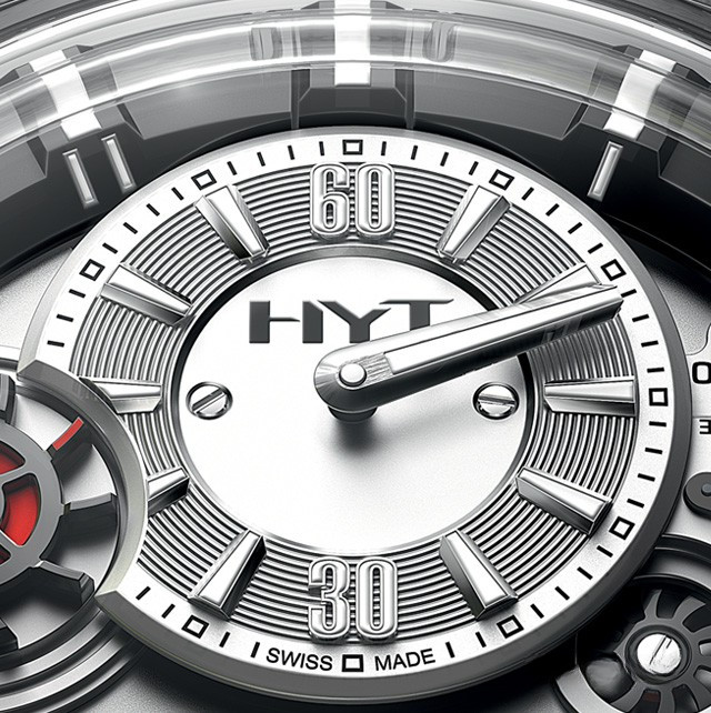 Часы HYT H1 представлены в корпусе размером 48.8 х 17.9 мм из титана с водонепроницаемостью до 100 метров. Внутри корпуса установлен механизм с ручным заводом, обладающий запасом хода 65 часов. На серебристом циферблате отображаются часы, минуты, секунды, запас хода. Часы поставляются на каучуковом ремешке с титановой вставкой.