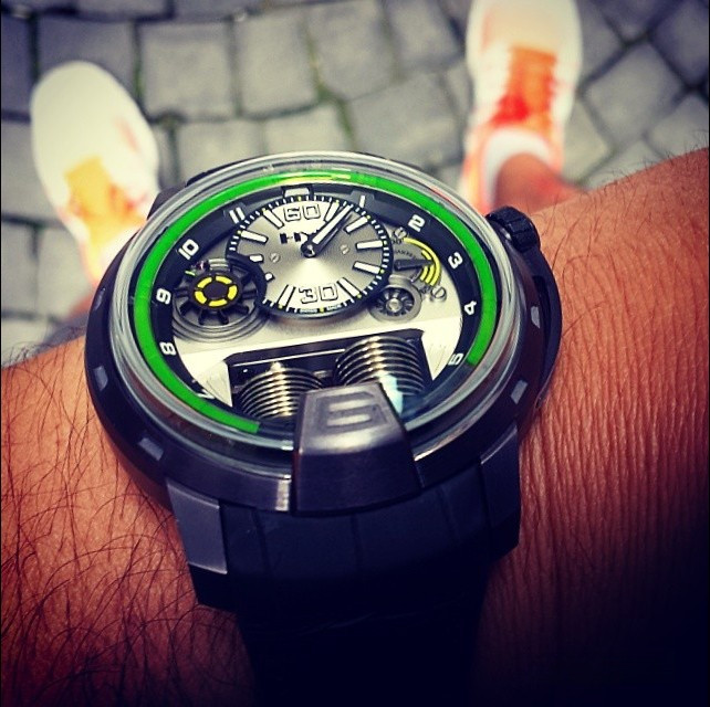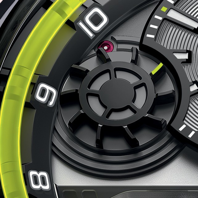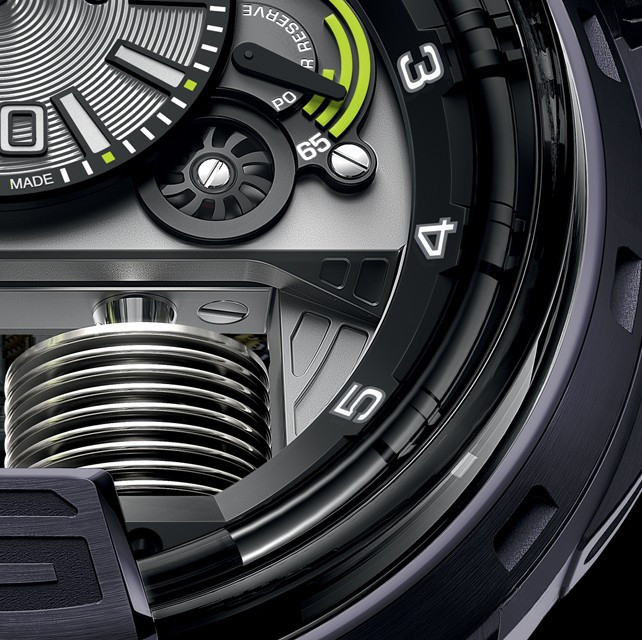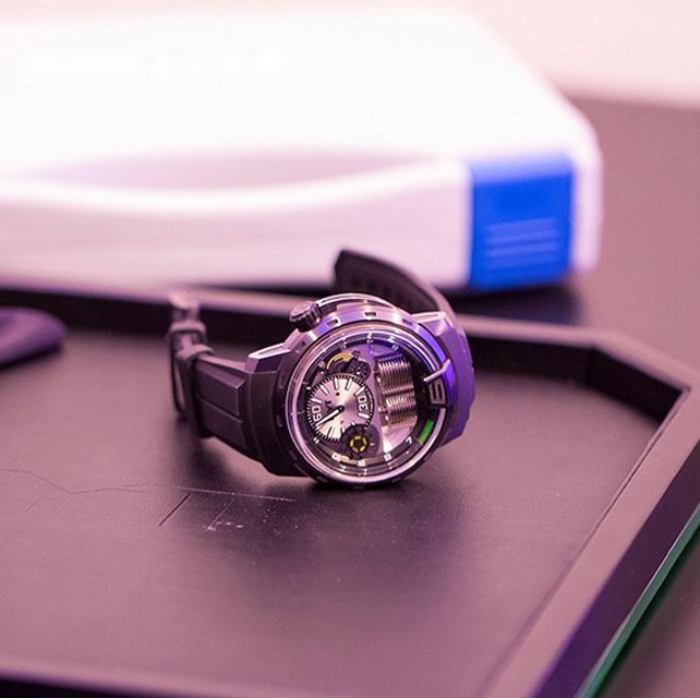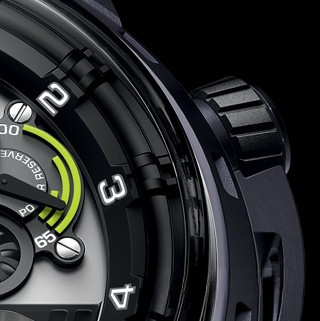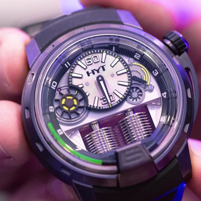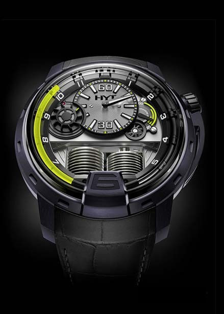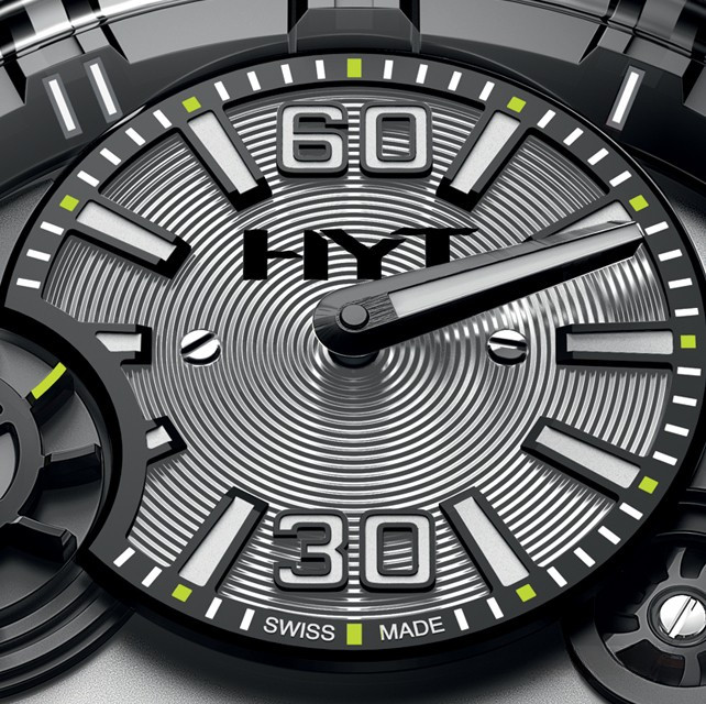 Часы HYT H1 представлены в корпусе размером 48.8 х 17.9 мм из титана с покрытием PVD с водонепроницаемостью до 100 метров. Внутри корпуса установлен механизм с ручным заводом, обладающий запасом хода 65 часов. На сером циферблате отображаются часы, минуты, секунды, запас хода. Часы поставляются на ремешке из кожи аллигатора с титановой вставкой. Серия ограничена 50 шт.