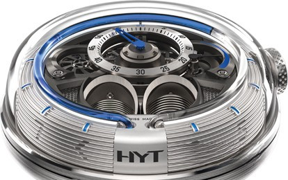 HYT H1.0 – новинка от HYT, чьи часы основаны на принципах гидромеханики. Время указывается визуально незаметным мениском, который отделяет цветную жидкость от прозрачной внутри невероятно тонкого стеклянного капилляра. Минуты указываются с помощью традиционной минутной стрелки, установленной на 12-часовом вспомогательном циферблате на 12-ти часах. В процессе работы появились различные другие индикаторы и функции, такие как секундная стрелка, индикаторы запаса хода и динамо-лампочки. 65-часовой индикатор запаса хода наконец-то стал понятным и простым в использовании. Жидкостный индикатор сам по себе синий, что резко контрастирует с серым циферблатом. Секундная стрелка в этой модели имеет форму спицевидного колеса и расположена на 10-ти часах. Диаметр корпуса составляет 48.8 мм. Он почти полностью изготовлен из сапфира, за исключением основания и коронки из нержавеющей стали.