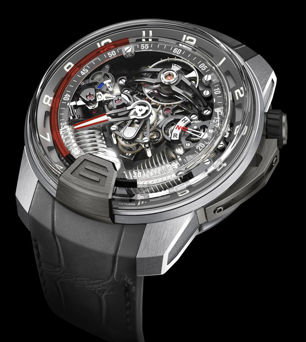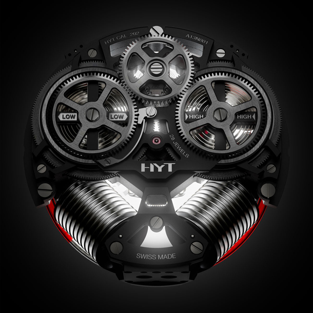 Часы H2 Platinum & Titanium Red (ref. 248-TP-00-RF-AB) от мануфактуры HYT представлены в корпусе диаметром 48.8 мм. Корпус часов Red изготовлен из титана и платины 950. Циферблат часов H2 Platinum & Titanium Red скелетонирован. Особенностью моделей новой серии H2 является использование жидкости для индикации времени. На часах имеются два гибких резервуара, которые закрепляются на концах капилляра. Они заполнены флуоресцентной и прозрачной вязкой жидкостью, которые при этом не смешиваются из-за различной плотности. Эти резервуары расположены на позиции 6 часов. В случае, когда один резервуар сжимается, второй, в свою очередь, - расширяется, что обеспечивает движение жидкости. С изменением времени жидкость передвигается в тубах. Вся эта гидро-система работает на базе механического Калибра с ручным заводом. Часы комплектуются кожаным ремешком с титановой застежкой. Серия ограничена - 14 штук.
