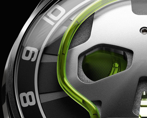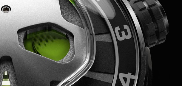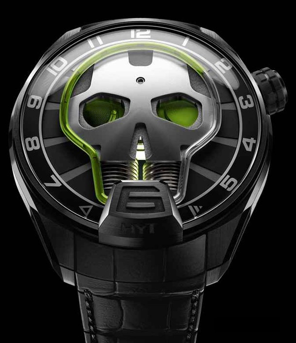 Часы HYT Skull выпущены в корпусе из титана с покрытием DLC. Размеры корпуса 51 х 17.9 мм, водонепроницаемость до 50 метров. Ввинченная заводная коронка с резиновым покрытием. Черный титановый купол расположен на уровне 6 часов. Выпуклое сапфировое стекло с антибликовым покрытием на стороне циферблата; сапфировое стекло на задней крышке корпуса. Внутри корпуса установлен механический эксклюзивный Калибр HYT с ручным заводом с балансовой частотой 28 800 пк/ч, 4 Гц, 35 камней. Мосты ручной работы, скошенные и украшенные Côtes de Genève, родиевое покрытие мехов, 65-часовой запас хода. Ретроградная зеленая часовая стрелка из жидкости; индикация секунд, запаса хода. Циферблат неструктурированный черного цвета, часовая стрелка из жидкости. Секундный циферблат (левый глаз). Индикатор запаса хода (правый глаз). Ремешок из кожи аллигатора, черная пряжка из титана с покрытием DLC.