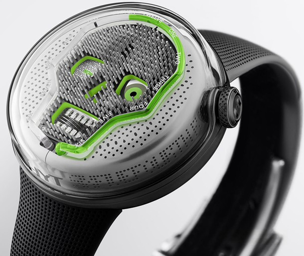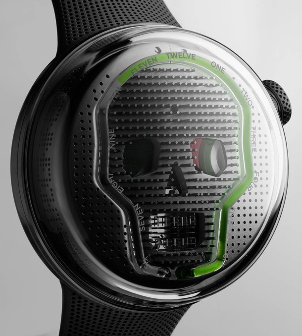 Корпус часов HYT Skull H0 Soonow диаметром 48.8 мм выполнен из нержавеющей стали с покрытием DLC. На серебристом с черным циферблате отображаются часы, минуты, секунды, запас хода. Сквозь заднюю крышку корпуса можно видеть работу сложного механизма, приводящего в действие жидкостный модуль. Калибр с ручным заводом разработан совместно Chronode. Его балансовая частота составляет 4 Гц, запас хода 65 часов. Мосты скошены вручную и украшены женевскими волнами. Модель HYT H0 Soonow представлена на каучуковом ремешке с застежкой из титана. Серия ограничена - 25 шт.